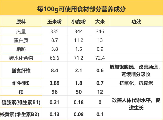 玉米粉相对传统的小麦粉原料,最大的优势是含有常规谷物原料好几倍的膳食纤维含量,提供充足的“吃饭感”与饱腹感的同时促进肠道功能。另外,玉米粉还含有丰富的B类维生素,镁,铁等能人体必需的营养元素,还含有高出普通主食十几倍的多酚、维生素E等常见的抗氧化成分。