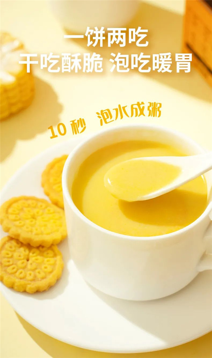 当然,光靠原料上的创新,一款产品还不足以吸引足够的关注。这款“玉米脆脆烧”产品的另一大亮点,就是可以一饼两吃,可以直接干吃,也可以直接泡水成为玉米糊吃。就如官方宣传文案写的“干吃酥脆,泡吃暖胃”。多种吃法的可能性,让这款产品的趣味性和话题性一下增加了不少。同时又打开了诸如早餐、夜宵、代餐等更多的食用场景,无疑为这款产品增加了更多的购买驱动力。