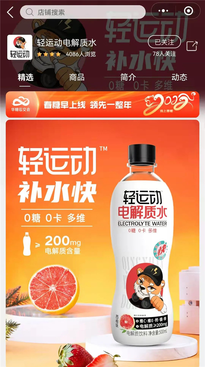 轻运动品牌瞄准这一商机,重磅推出了含汽型电解质水,作为主打“补水”的健康饮品,轻运动电解质水补水更快,口感更好。为开展全国布局,轻运动空中先行,线上发力。目前,轻运动电解质水已成功入驻线上春糖“四星级”店铺,一经上线,就受到了众多经销商的青睐。