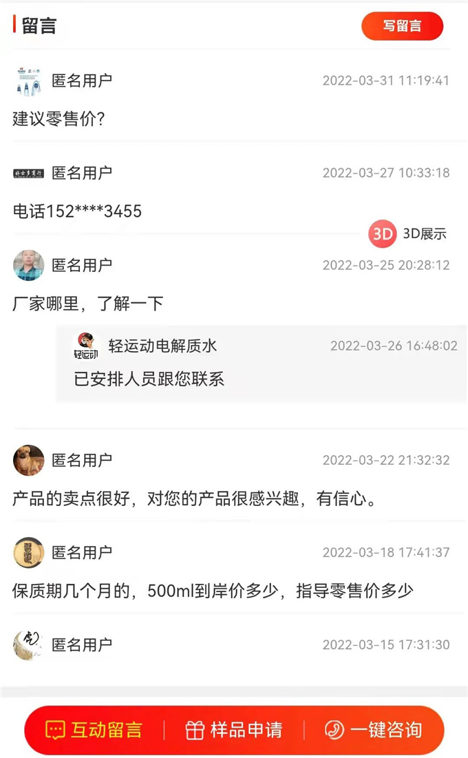 疫情可以阻挡我们线下聚集,却无法阻止我们线上参展选品。3月中下旬,轻运动携电解质水入驻线上春糖。依托线上春糖强大的资源优势,一上线就获得了经销商的高度认可,目前收到了近百条来自山西榆林、江苏淮安、江西赣州、甘肃兰州、山西太原、浙江台州等地的代理意向。线上春糖已成为企业新品首发、产品展示、品牌传播的重要基地。