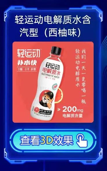 为了更直观地让经销商了解产品,轻运动3D展厅上线,进行360°极致产品展示,在突出个性卡通形象、营养成分、产品卖点等产品信息的同时,全方位、立体化地展现了轻运动电解质水大气简约的包装设计。