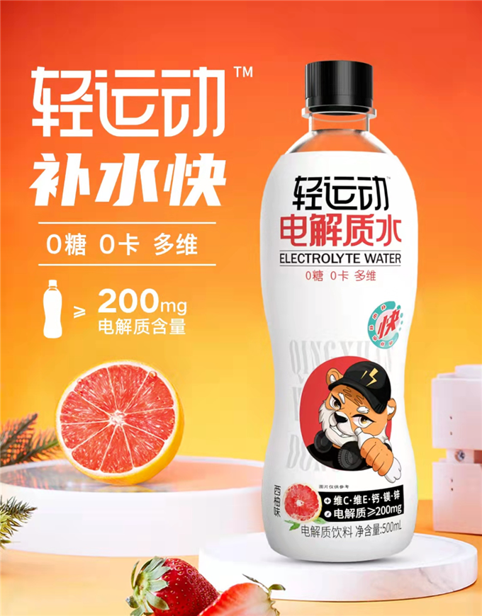 快速补水,快速补充能量,一定不能错过轻运动电解质水。轻运动电解质水是一款面向大众的能量补充饮料,每瓶电解质的含量大于200m,能快速补充身体流失的水分,缓解身体疲劳。同时,作为一款含汽型的饮料,轻运动电解质水让消费者在获取能量补充营养的同时,享受气泡带来的刺激口感。