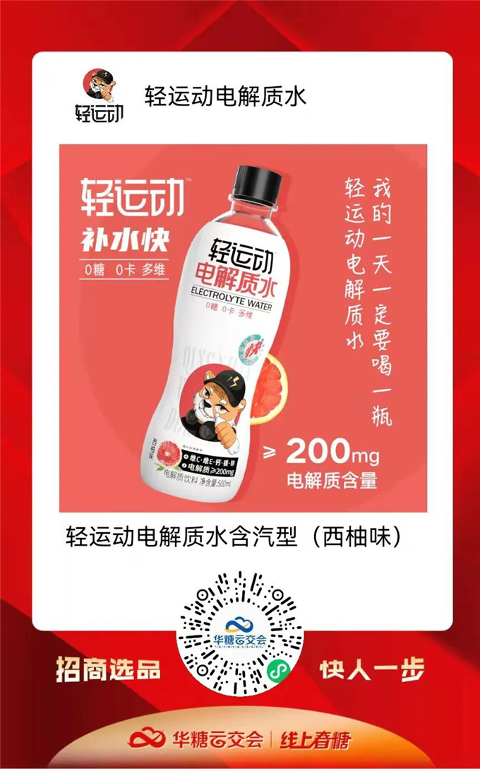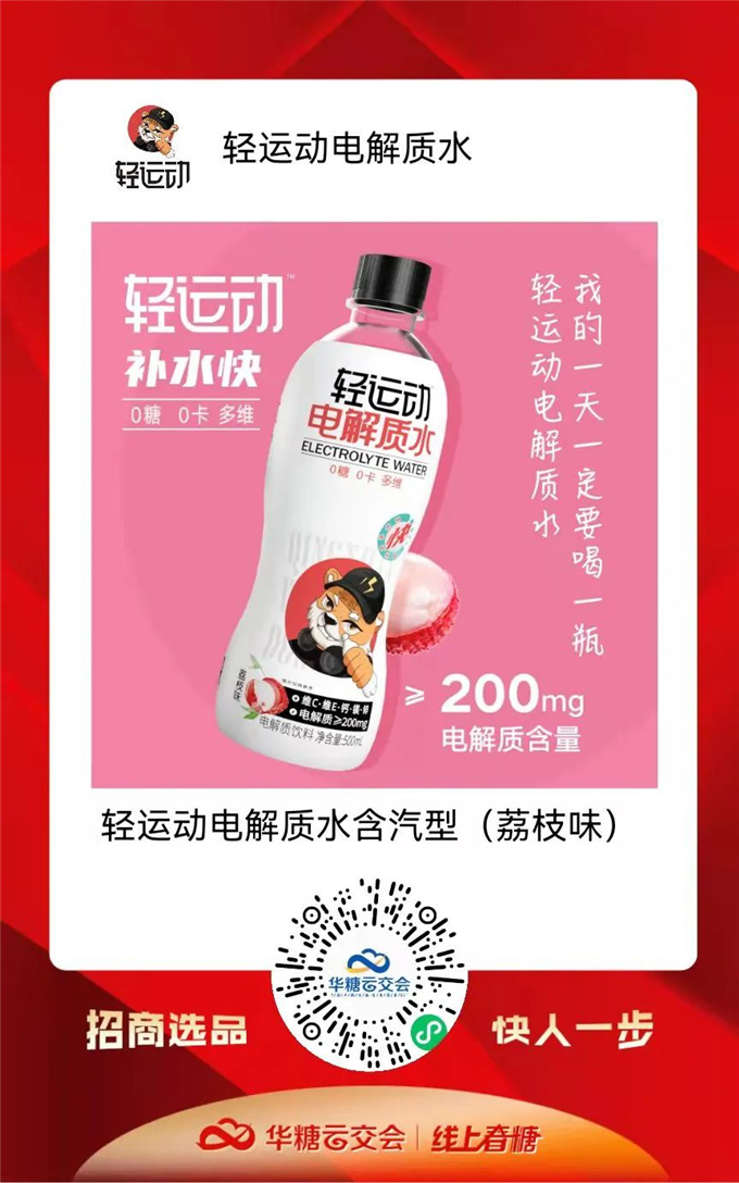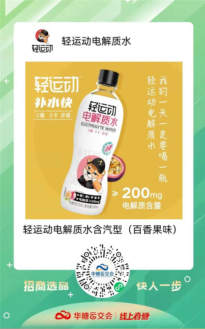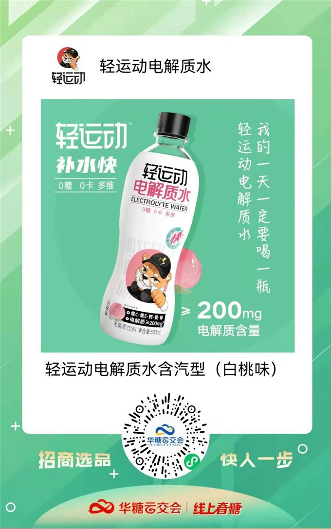 目前,轻运动电解质水推出的白桃味、荔枝味、西柚味和百香果味四种清爽口味饮品已在线上春糖上线,欢迎广大经销商朋友一键详询代理!