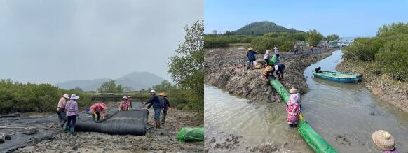 目前,项目已完成红树林种植前主要的准备工作,首先对所选地块中的互花米草进行刈割和翻根,并平整土地。此后,工作人员在区域内覆盖了双层遮荫网,以抑制互花米草重新生长并加快其根部腐烂;还围绕修复地块挖掘了一条约 3 米宽、0.8 深的潮沟,联通周边水系,以隔离周边的互花米草,为春季的红树苗种植创造适宜环境。