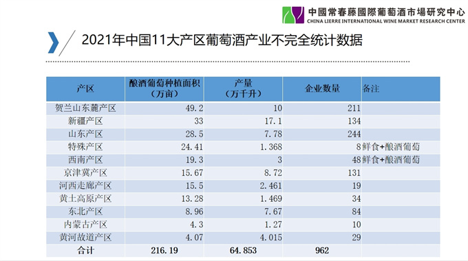 张建生特别发布了常春藤机构近两年对中国葡萄酒产量的调研数据,报告显示,中国酿酒葡萄种植面积小幅下降,是优劣调整的结果,葡萄酒产量近几年始终处于稳定状态,变化不大。截止2022年,中国十一大产区共有酿酒葡萄种植面积220多万亩,生产了约60多万千升葡萄酒,其中贺兰山东麓产区以59.2万亩10万千升葡萄酒和228家葡萄酒庄,居产区首位,新疆产区以33万亩酿酒葡萄种植面积居第二,以17万吨葡萄酒产量居第一。