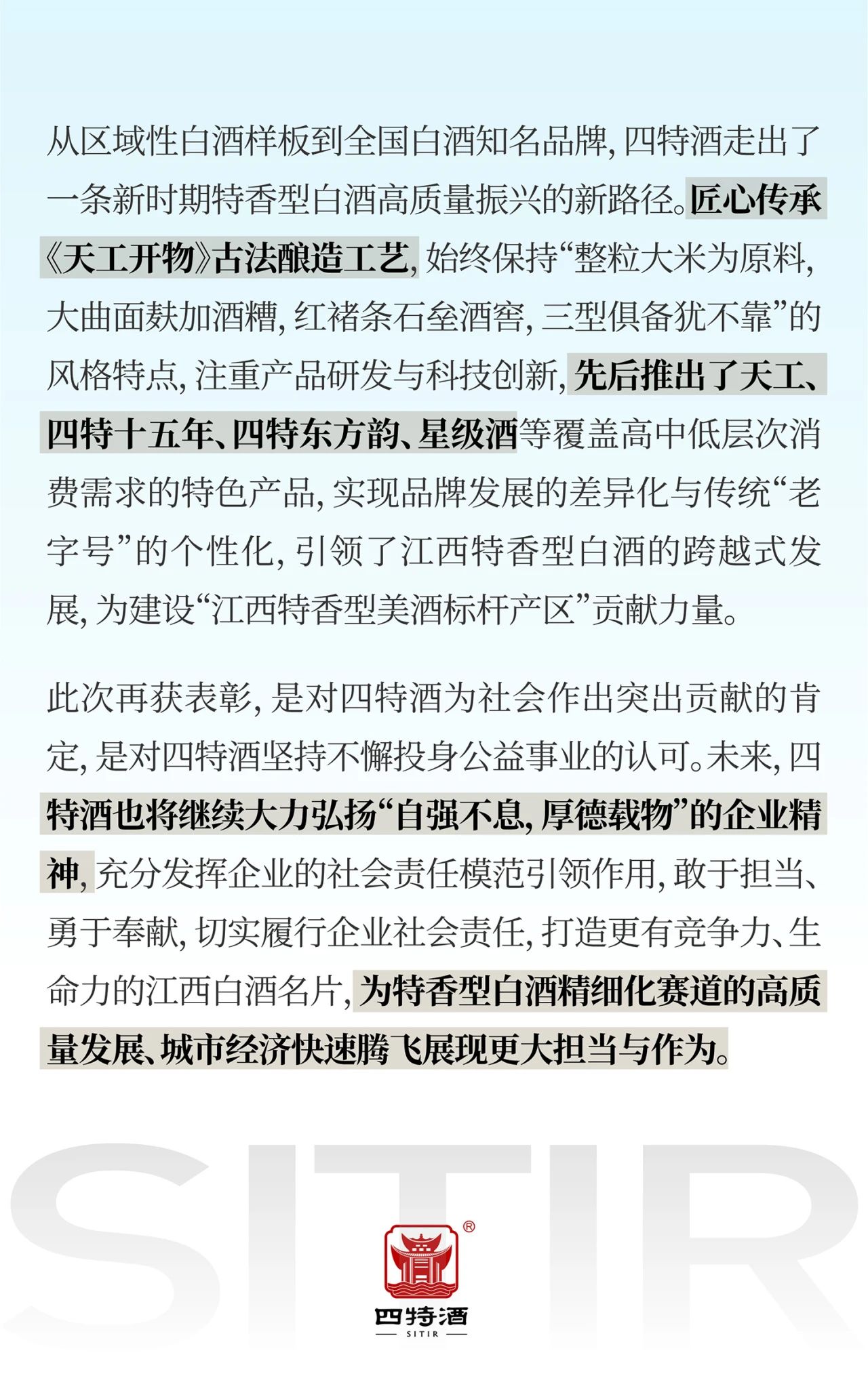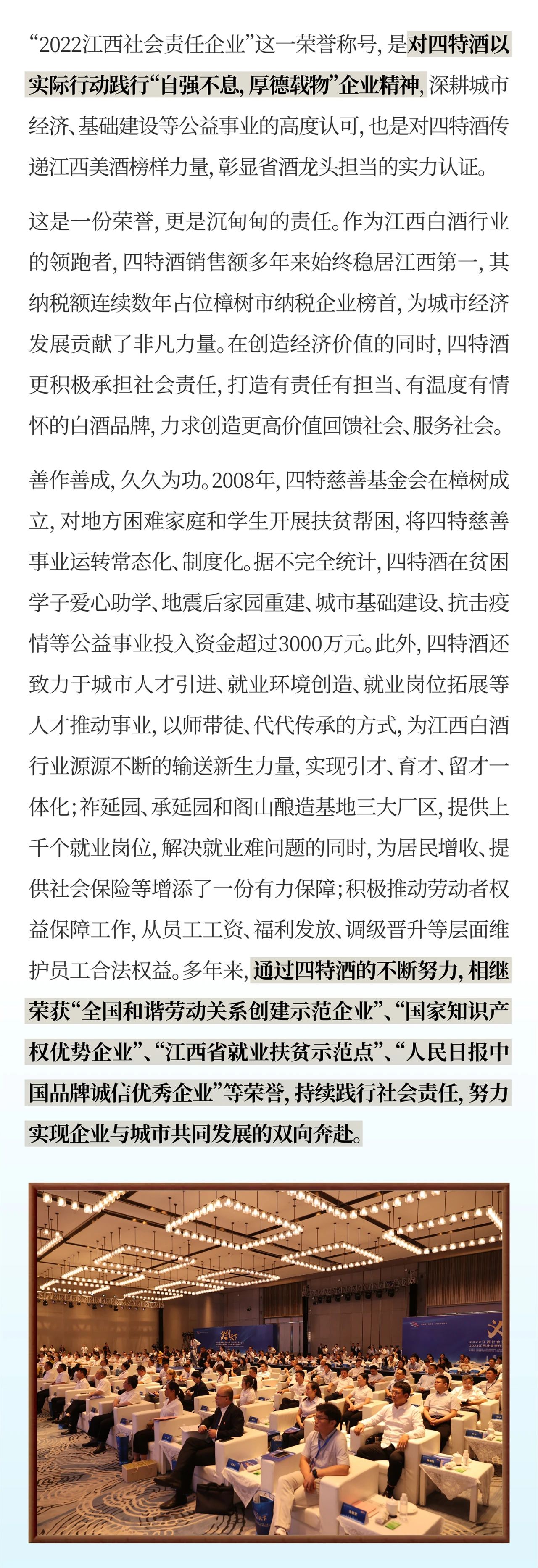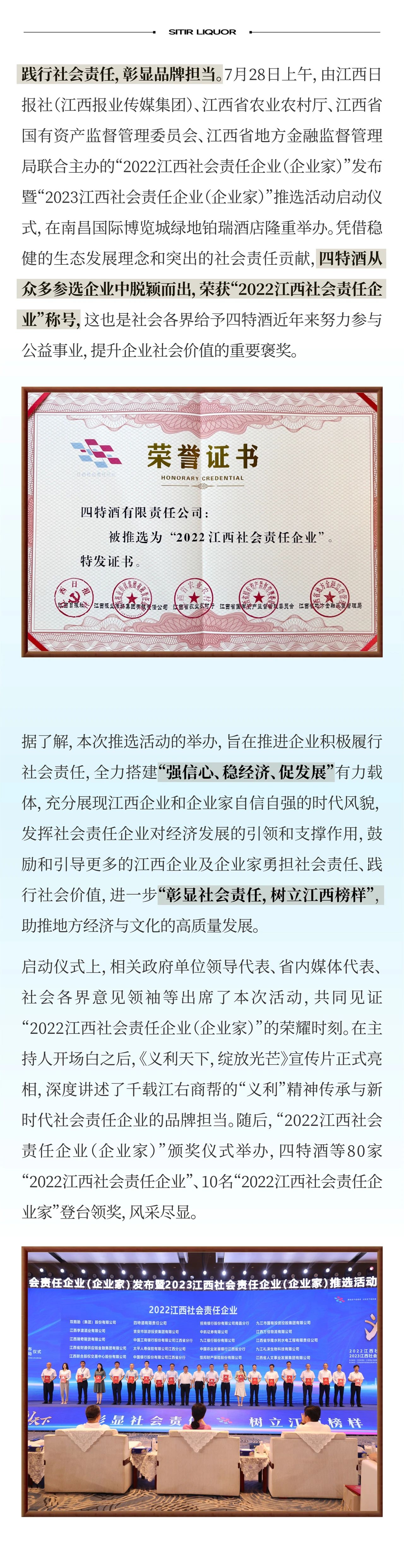 凝心聚力,践行尽责!四特酒喜获“2022江西社会责任企业”