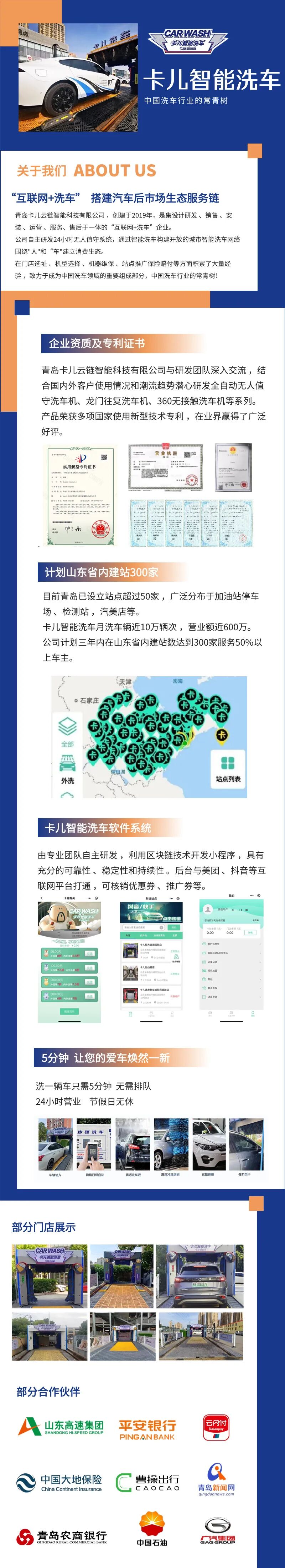 青岛卡儿云链智能科技有限公司,创建于2019年,是集设计研发、销售、安装、运营、服务、售后于一体的“互联网+洗车”企业。公司自主研发24小时无人值守系统,通过智能洗车构建开放的城市智能洗车网络围绕"人"和“车"建立消费生态。