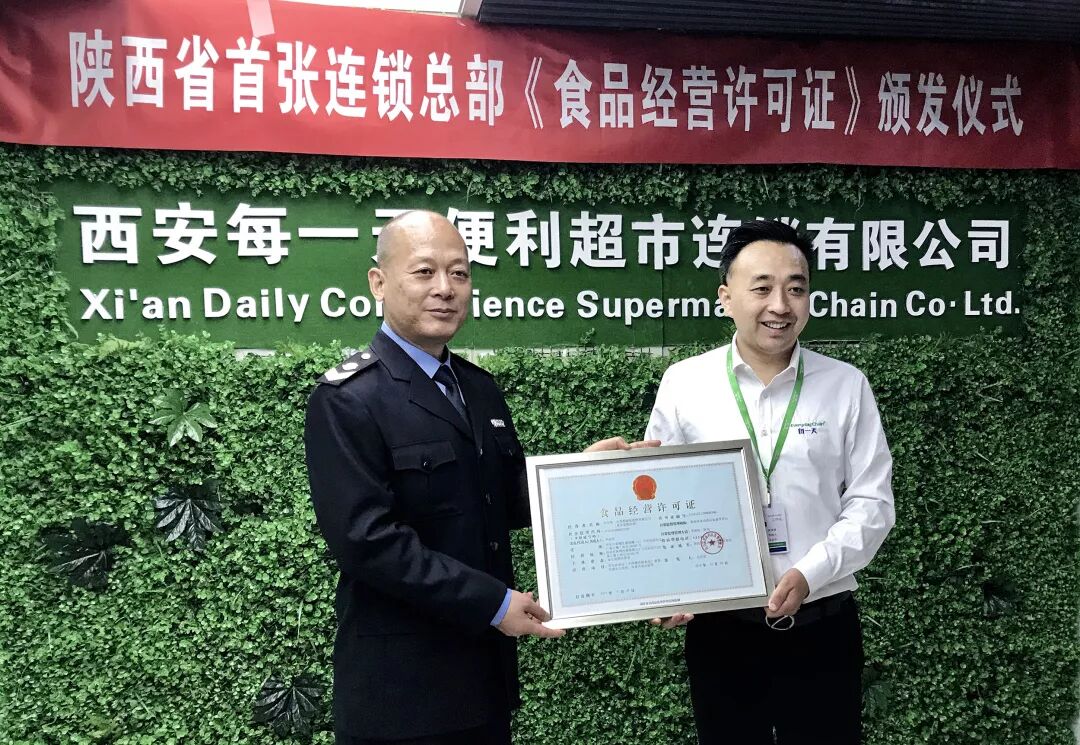 在太平洋大厦10层西安每一天便利超市连锁有限公司总部创始人张培彦从省食品药品监督管理局副局长任彦保手中接过一张连锁总部《食品经营许可证》,这是陕西省贯彻落实“放管服”改革精神,强化食品经营企业主体责任,营造更加宽松便捷的市场准入环境后颁发的首张连锁总部《食品经营许可证》。 以前,食品连锁总部开办新门店时,要在区县局申报资料,经过形式审查、现场核查、审批发证等流程,需要20个工作日,异地办理,费时费力,企业负担较大。 而如今是在政策法规框架下通过优化食品经营许可流程,对品牌食品连锁企业新增门店开辟了快速通道,通过优化流程、简化手续、对符合“统一名称、统一采购、统一储存、统一配送、统一核算、统一管理”条件的食品连锁总部,在省或市食品监管部门办理《食品经营许可证》! 西安连锁经营协会会长,每一天便利店董事长张培彦表示,协会将积极为会员单位服务,下一步将安排专人,为需要《食品经营许可证》的连锁企业提供相关业务咨询和协助办理。
