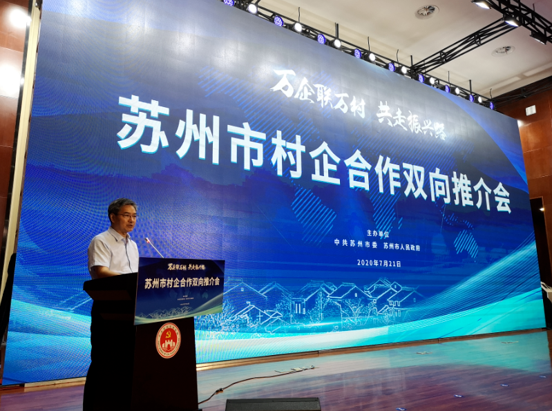 2020年7月21日下午,苏州市村企合作双向推介会举行,超过150家意向合作企业负责人参加活动。苏州市委副书记朱民出席活动。