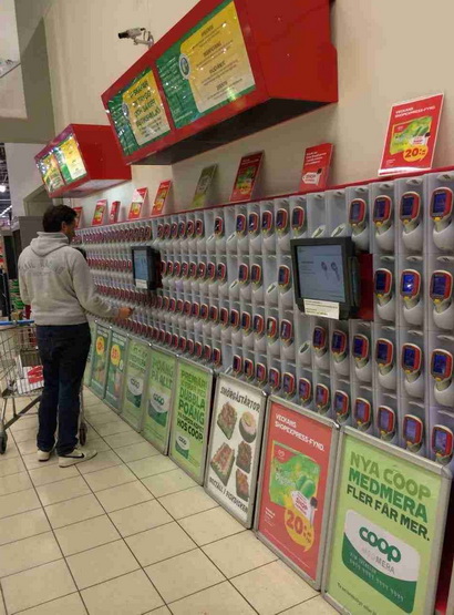 在瑞典参观了一家位于郊区的COOP FORUM门店,面积15000平米,对于高度法制社会,人的诚信对于社会的价值,可以从超市有直观的感受。作为COOP超市的会员,在入口处(SHOP EXPRESS)刷会员卡可获得电子扫描枪,自己按需取纸质环保购物袋,边选商品边扫描,扫描后的商品也会显示在扫描枪的小屏幕上,最后自助刷卡结算。大概15000平米的卖场只有3个收银员,他们主要服务非会员及不会操作设备的老年人。以下是扫描枪、卖场的图片。