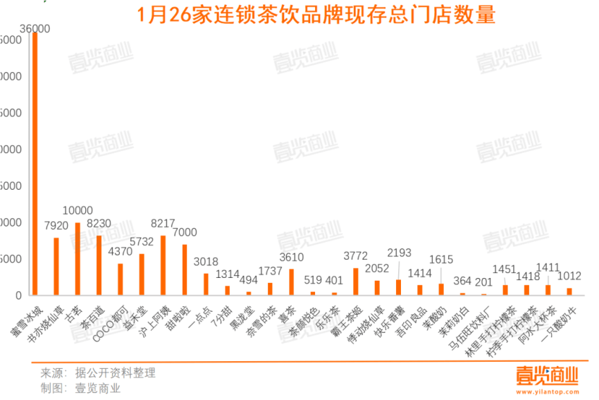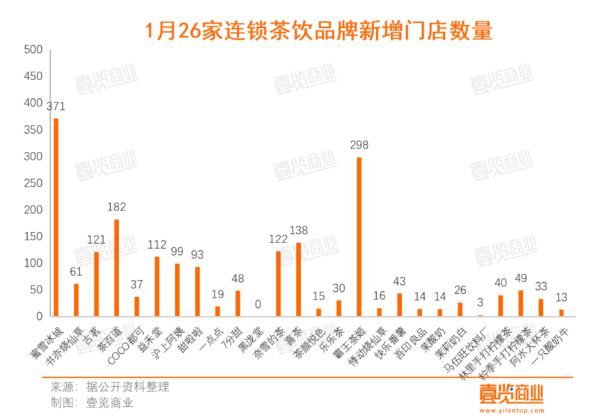 1月份,壹览商业长期跟踪的国内26家连锁茶饮品牌共新开门店数量与上月相比减少988家。