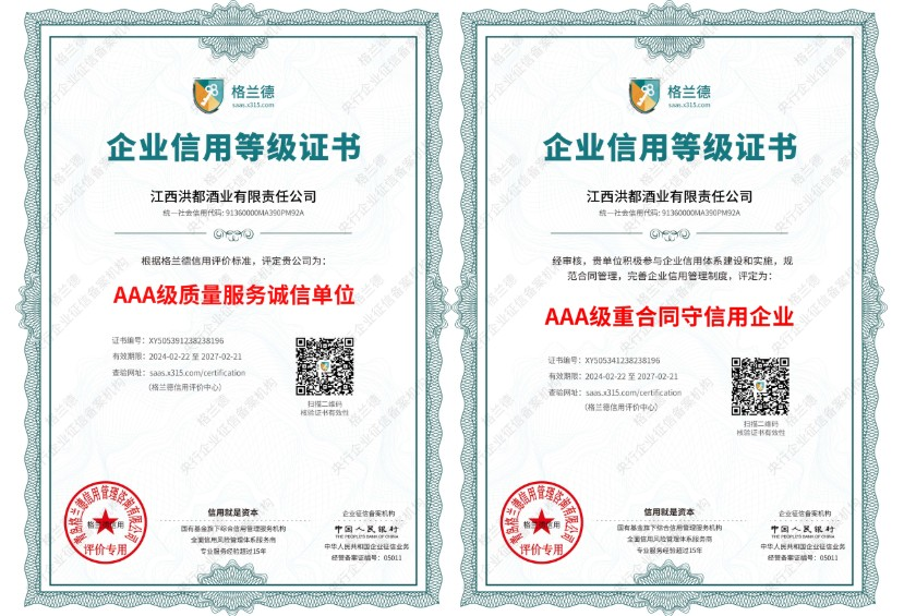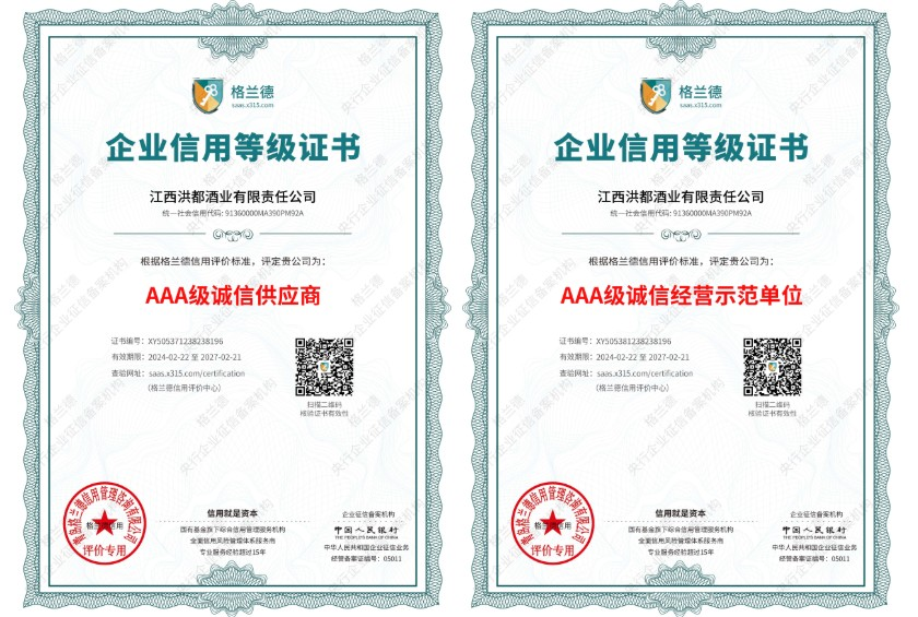 此次荣获“企业信用评价 AAA 级信用企业”称号,标志着江西洪都酒业在诚信经营、企业信用建设方面迈上了新的台阶。让我们共同期待江西洪都酒业在未来的发展中,继续书写诚信经营的辉煌篇章,为洪都老酒的传承与发展注入新的活力!