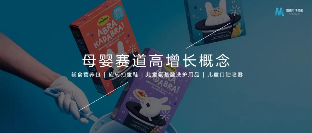 在母婴赛道中,我们发现了4个高增长概念:旋转扣童鞋、辅食营养包、儿童口腔喷雾、儿童氨基酸洗护用品。