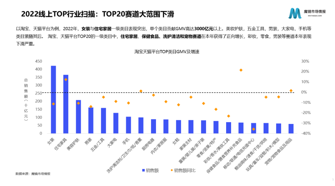 以淘宝、天猫平台为例,2022年,女装与住宅家居一级类目表现突出,单个类目贡献GMV高达3000亿元以上。美妆护肤,五金工具,男装,大家电,手机等类目紧随其后。淘宝、天猫平台TOP20的一级类目中,住宅家居、保健食品、洗护清洁和宠物赛道在本年获得了正向增长,彩妆,零食,男装等赛道本年表现下滑严重。