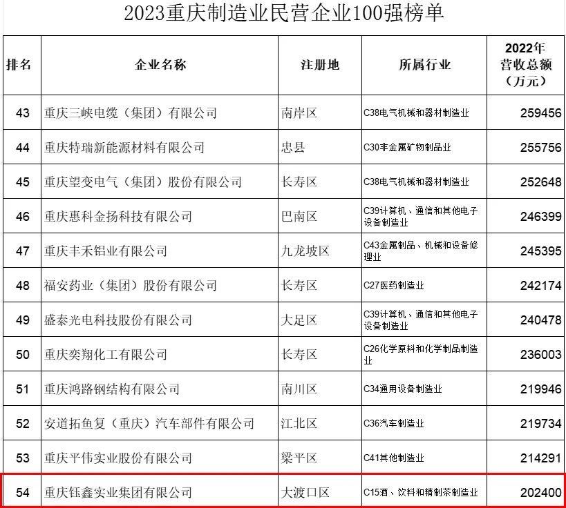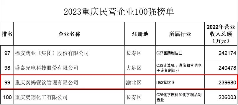10月17日,重庆市举办2023重庆民营企业100强发布会。重庆市火锅产业协会副会长单位重庆秦妈餐饮管理有限公司入围重庆市民营企业100强榜单,会员单位重庆钰鑫实业集团有限公司入围2023重庆制造业民营企业100强榜单,协会代表全体会员向以上企业表示热烈祝贺!