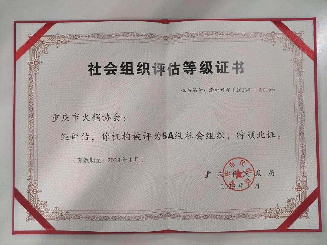 5月17日,为深入推进我市社会组织登记管理工作,促进社会组织健康有序发展,由重庆市民政局社会组织管理局组织,在市民政局会议室举行了2022年度重庆市全市性社会组织评估等级授牌仪式。经过主要领导和相关负责人综合评审之后,最终结果揭晓,重庆市火锅协会被授予为5A级社会组织,成为了全市餐饮业中独此一家获此殊荣的组织。