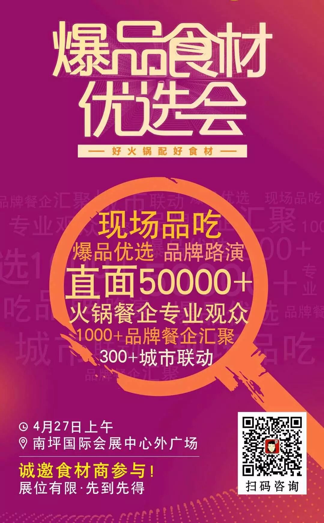 为打造一个火锅企业与食材企业的面对面交流平台,帮助火锅企业和食材企业之间高效对接,爆品食材优选会将作为第十三届中国餐饮产业大会暨2019中国(重庆)国际美食节/餐饮连锁加盟、食材博览会的一个亮点,于4月27日闪亮登场。