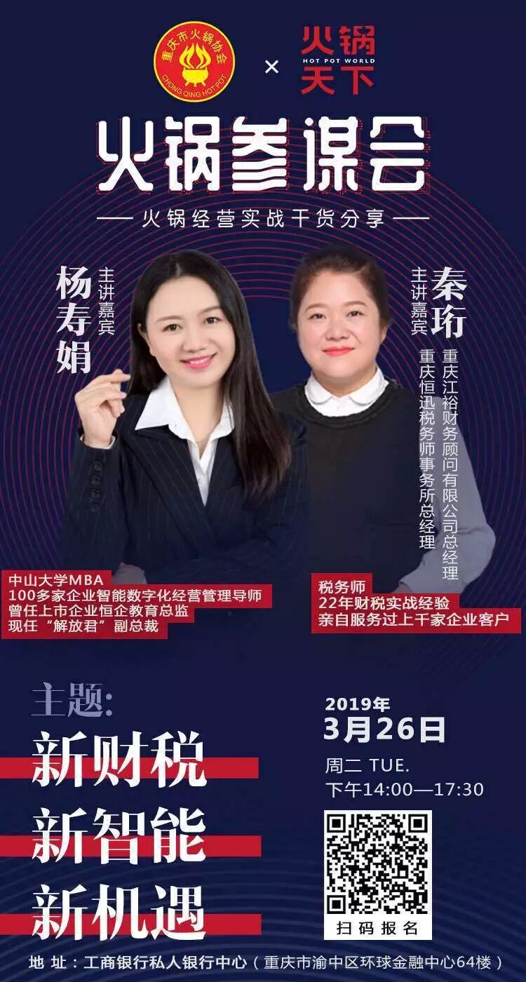 在赵庆先生关于“破局策略”的解析中,预算规划、财政分析、投融资模式等财税问题均是破局的关键。在3月26日即将开展的“火锅参谋会”上,我们将请到财税专家,就火锅老板们可能遇到的财税痛点进行专题分享。