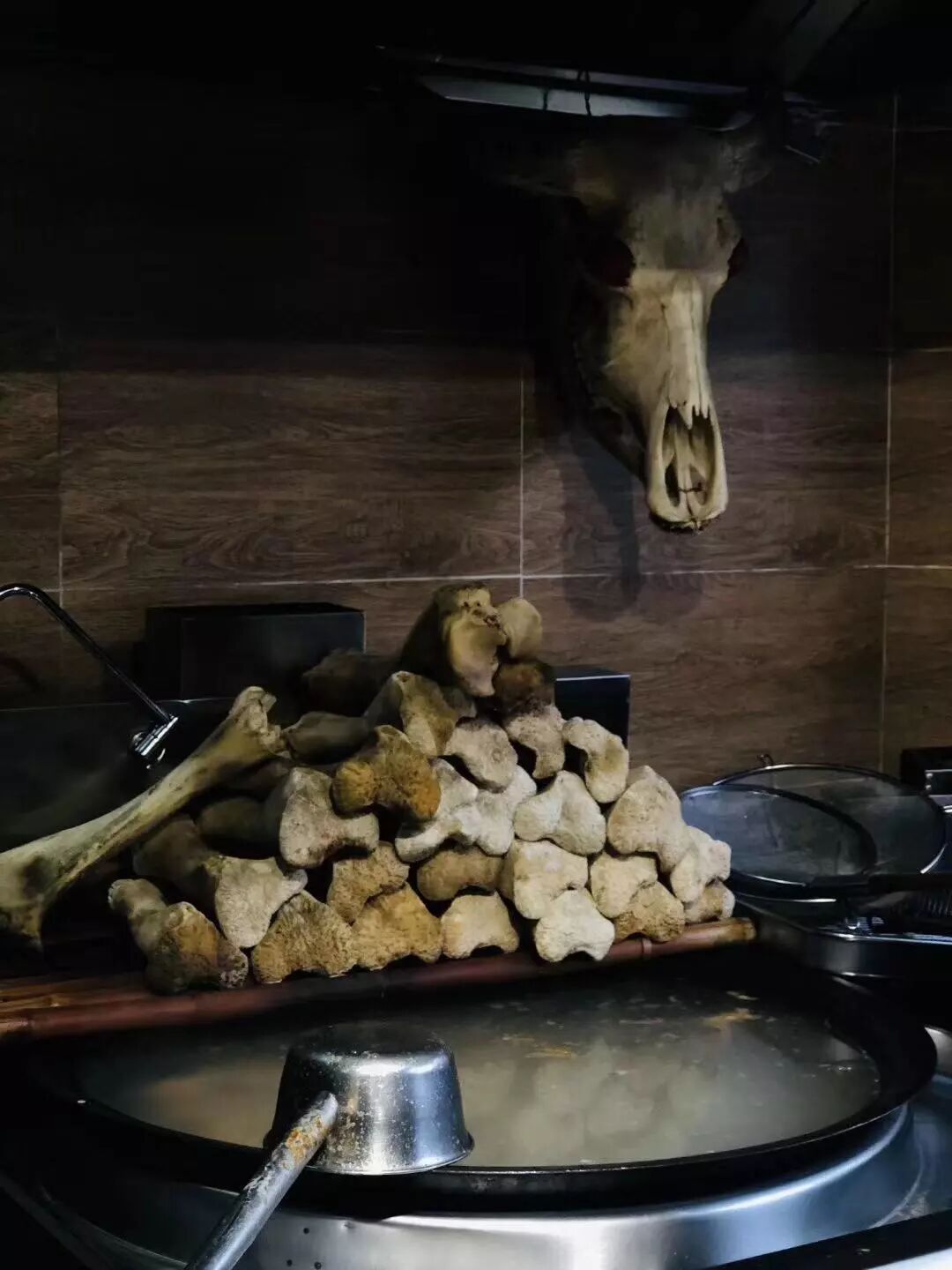 当你被门口架着的一大锅骨头汤和一堆粼粼白骨吓一跳时,头顶散布的灯光又会让你跌落进它暖黄的温柔中,如星辰似月光,脉脉不得语。