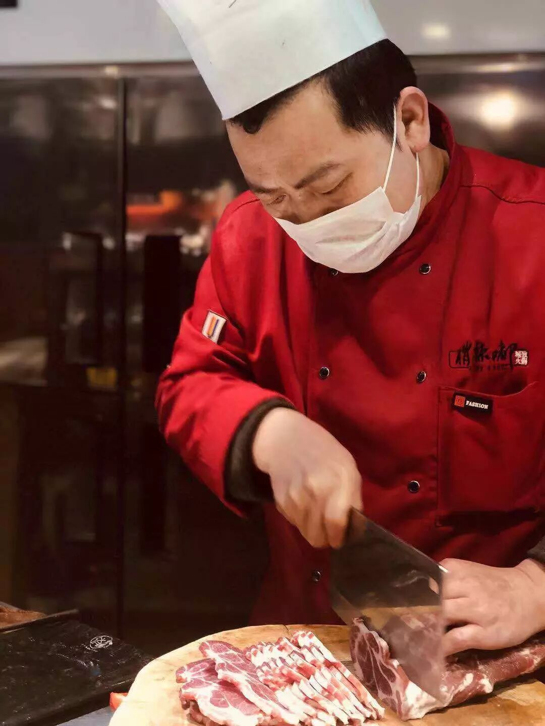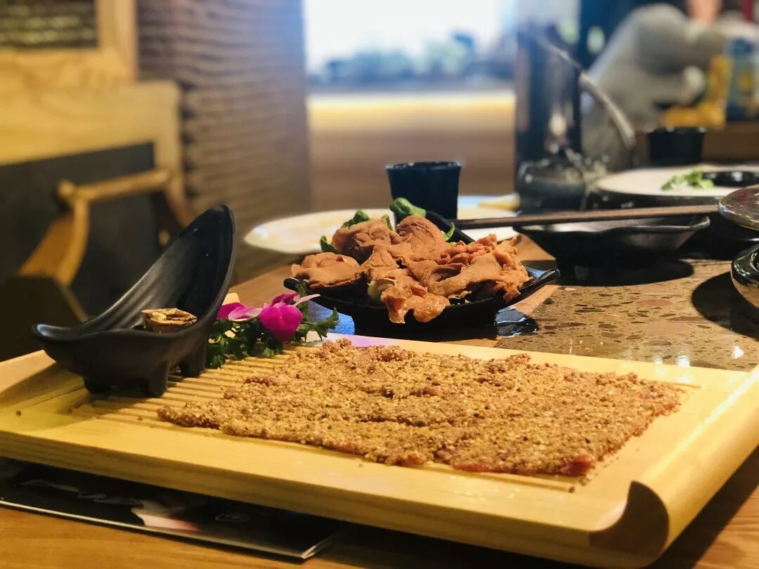 刀尖在案几上行走,师傅们专注手中的食材,顺着肉的纹理,切割成匀称透明的片状。