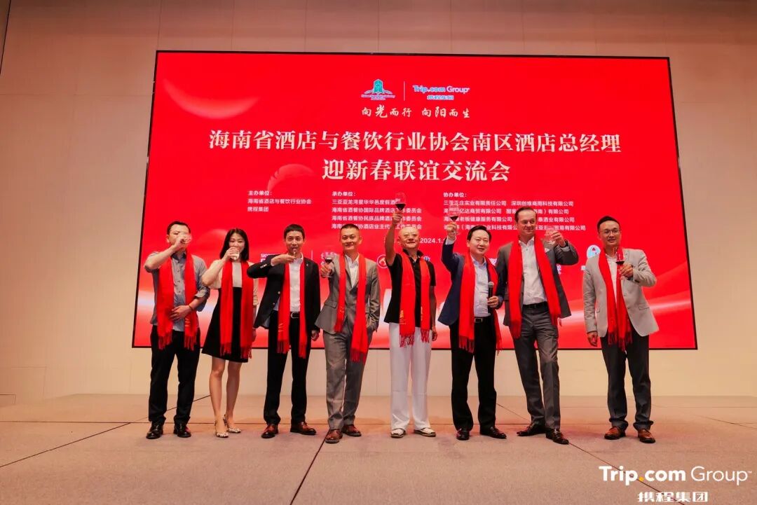 陈恒会长,中国饭店协会特邀副会长、云南省餐饮与美食行业协会创会会长杨艾军,携程大住宿事业群华南大区总经理王新卡,携程海南区总经理谭文斌及协会主席团主席朱若郁,洲际海南区域总经理雷恩先生,酒店业主代表郑勇先生,酒店总经理李锦共同敬酒