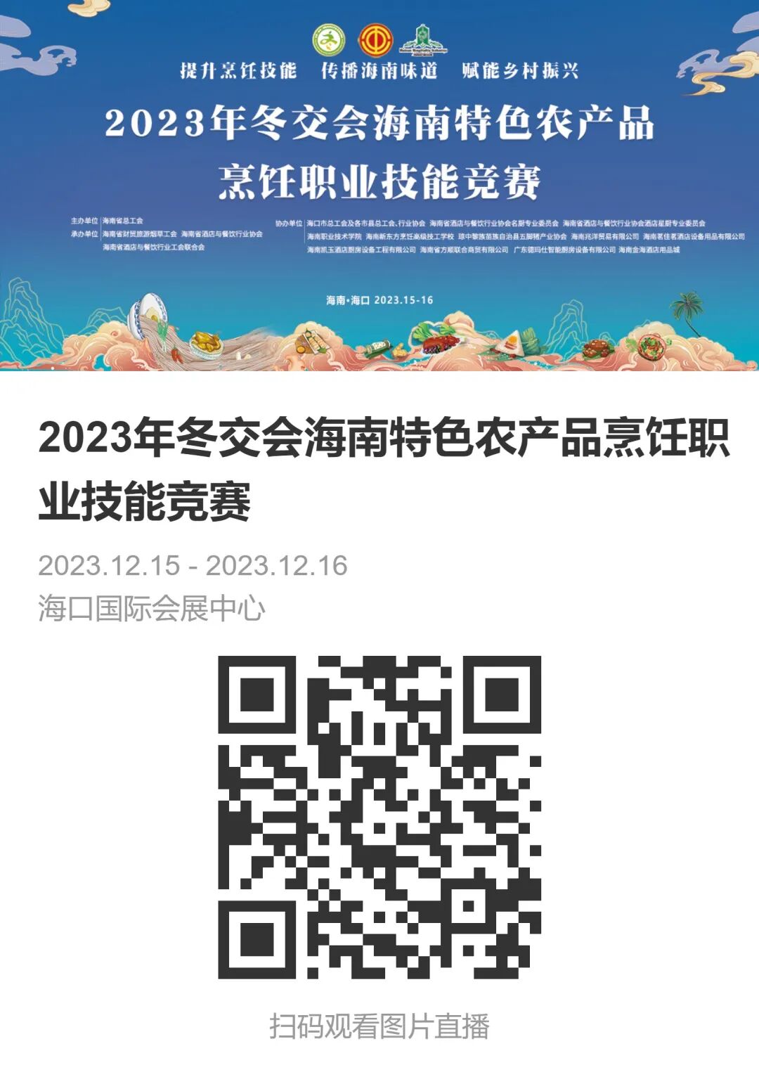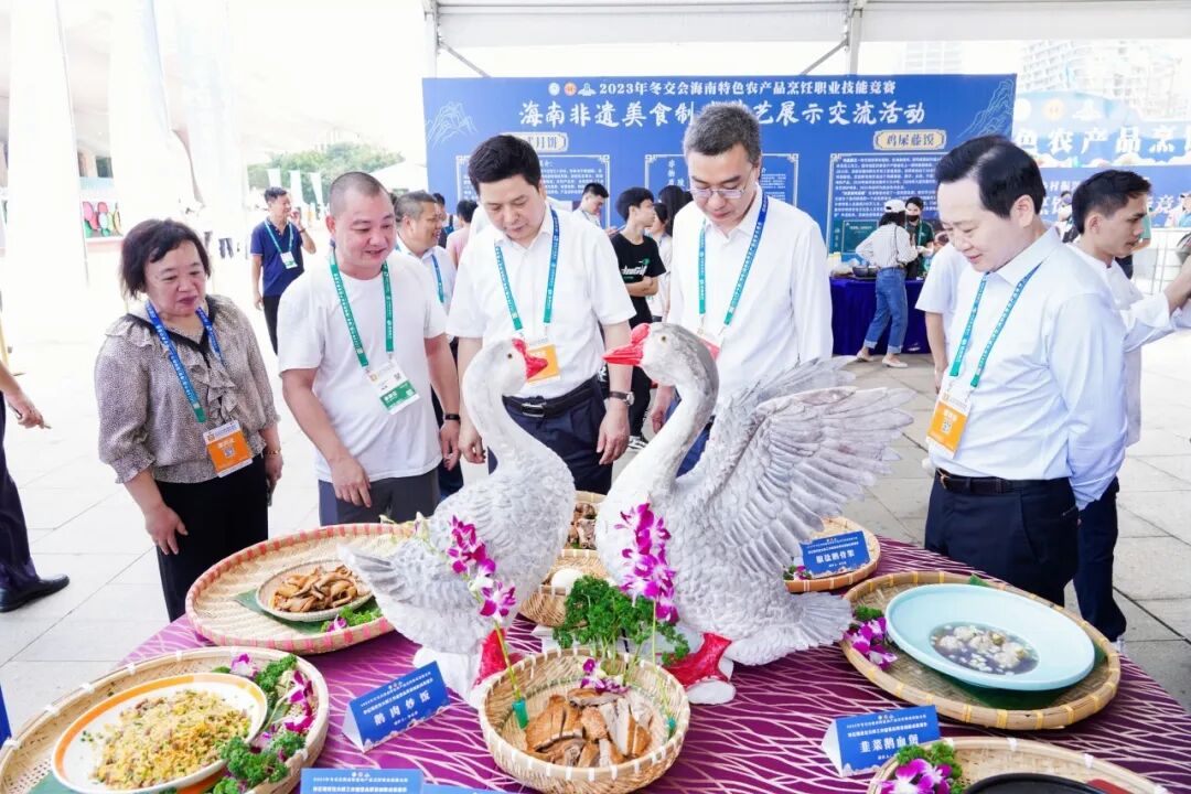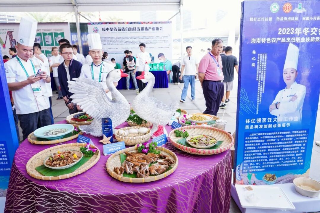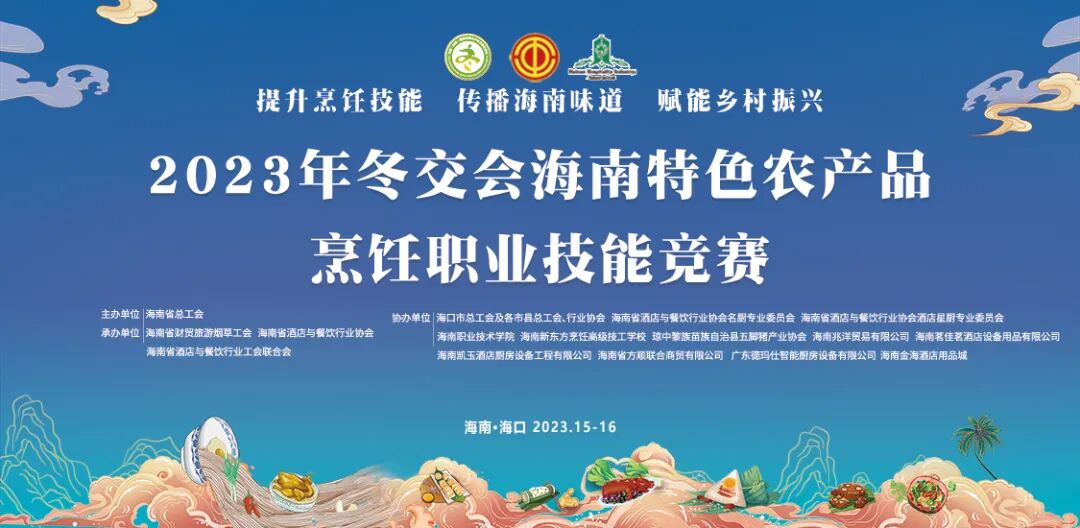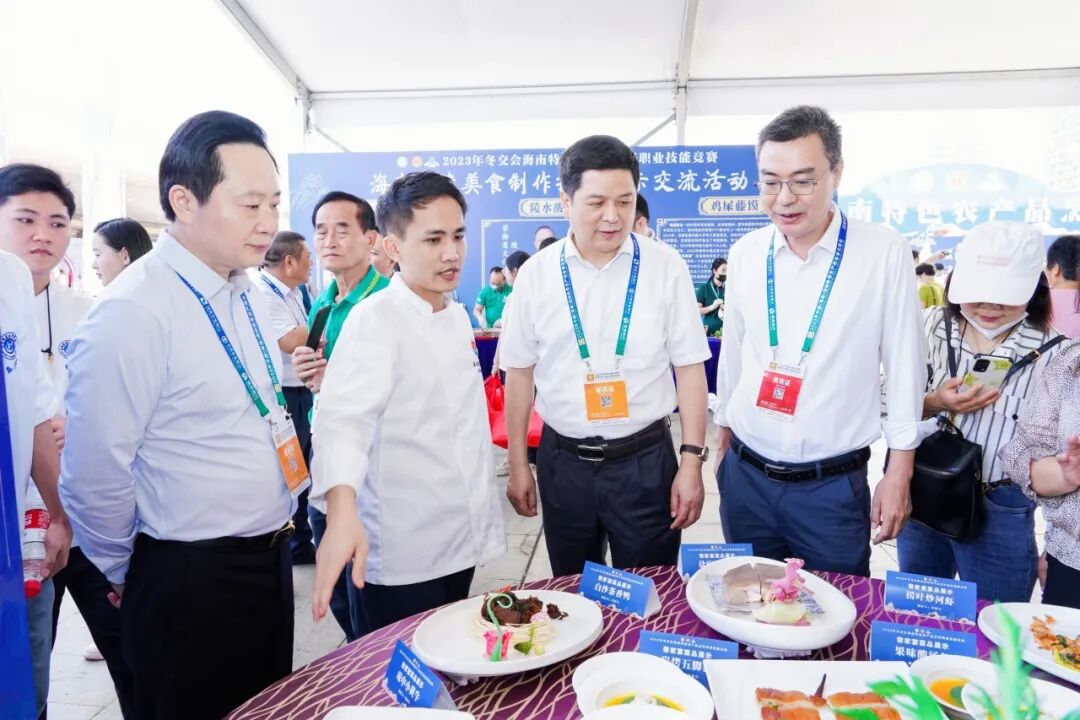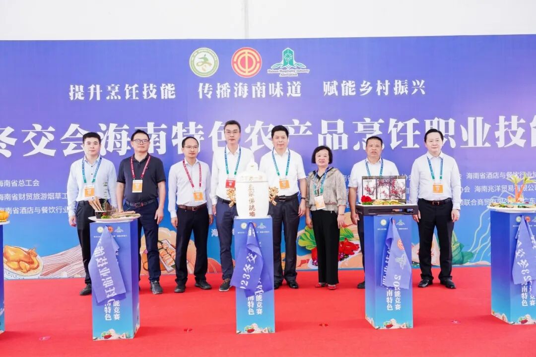 12月15日至16日,由省总工会主办,省财贸旅游烟草工会、省酒店与餐饮行业协会、省酒店与餐饮行业工会联合会承办,各市县总工会、酒店餐饮烹饪协会、省酒店与餐饮行业协会名厨委、省酒店与餐饮行业协会酒店星厨委协办的“2023年冬交会海南特色农产品烹饪职业技能竞赛”在海南国际会展中心广场隆重举行。省总工会党组成员、副主席苏良飞,省人力资源开发局党组成员、副局长洪日南,省商务厅消费处处长吴梁、省总工会经济技术部部长王玉燕、海口市总工会副主席李子、省财贸旅游烟草工会常务副主席童智忠、省人力资源开发局职业技能鉴定处副处长林森森、省酒店与餐饮行业协会会长陈恒以及各市县总工会和餐饮烹饪协会相关负责人,省内酒店餐饮企业负责人、参展企业、参赛选手、媒体代表500余人参加。