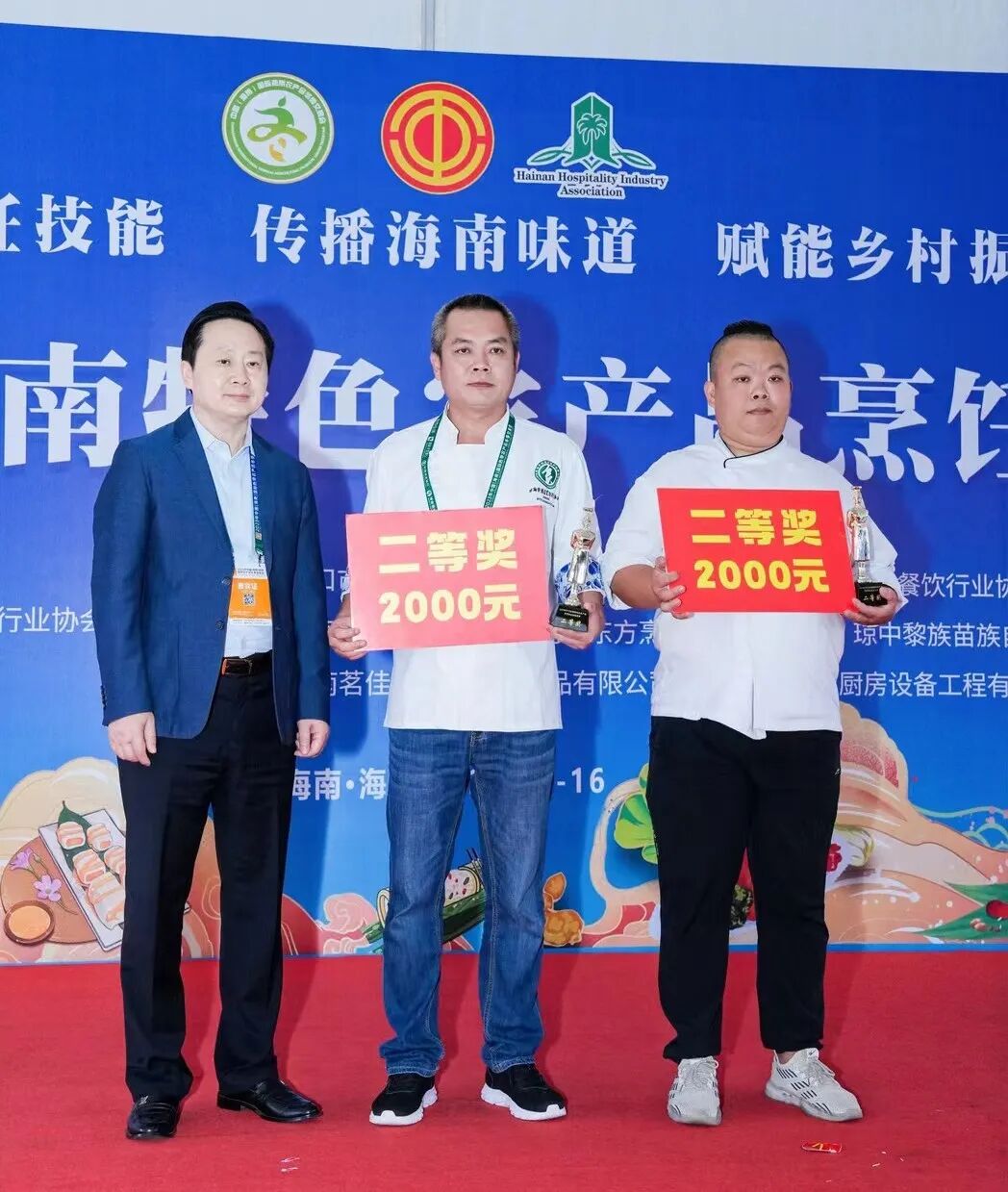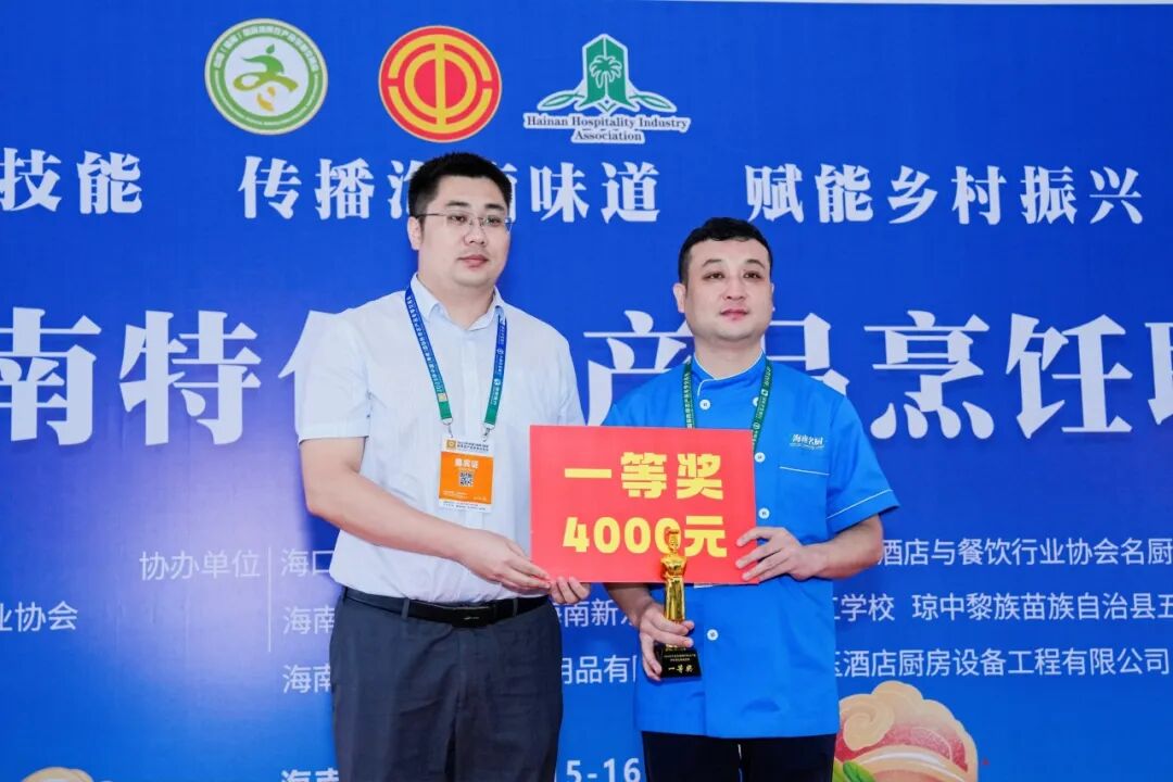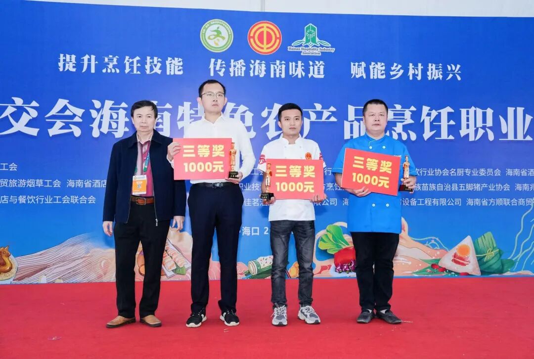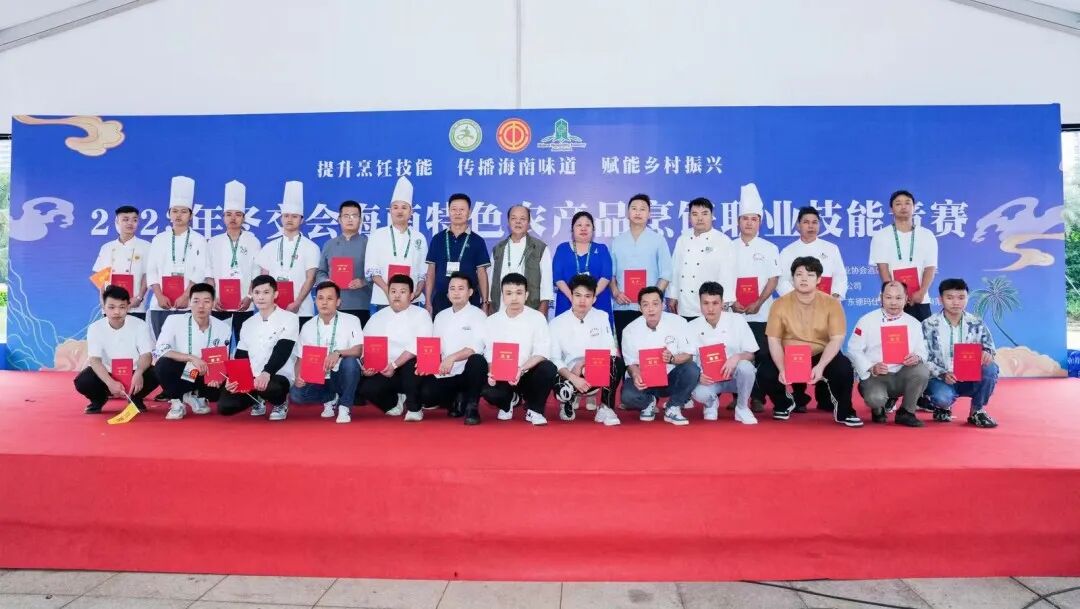 12月16日下午的颁奖仪式上,省酒店与餐饮行业协会会长陈恒、省财贸旅游烟草工会副主席郭威、省财贸旅游烟草工会三级调研员周才钦、省酒店与餐饮行业协会常务副会长兼秘书长陈刚,竞赛裁判长、中国烹饪大师李学深,琼海市酒店烹饪行业协会会长何子贵、儋州市美食行业协会会长侯群英、定安县餐饮烹饪行业协会会长陈若杰、五指山市旅游烹饪协会副会长兼秘书长王仕君、东方市旅游酒店与餐饮烹饪行业协会秘书长吴花、屯昌县餐饮烹饪协会秘书长郑德师、琼中黎族苗族自治县五脚猪产业协会会长韦秀芳等嘉宾出席,部分嘉宾为2023年冬交会海南特色农产品烹饪职业技能竞赛获奖选手颁发奖金和证书。