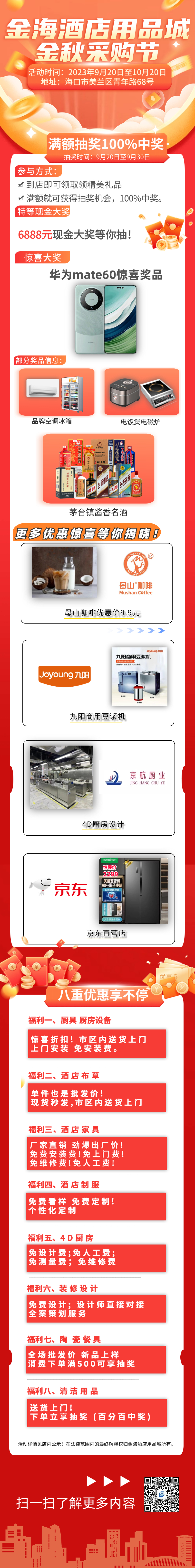 省酒餐协酒店用品与设备分会会长单位金海酒店用品城于9月20日至10月20日盛大举行金秋采购节。全场一件也是批发价,八重优惠,华为mate 60手机等着大家。活动期间到店即领精美礼品,酒店布草、陶瓷餐具、厨房设备、酒店家具等酒店用品一站购。买酒店用品到金海!