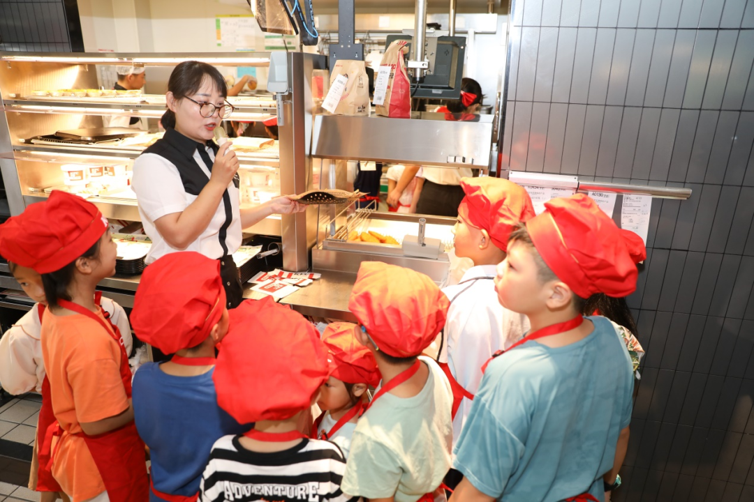 对于同学们来说能够亲眼见证平时爱吃的汉堡是如何做出来的绝对是一次既新奇又有趣的体验。在餐厅工作人员的带领下,大家戴上围裙和一次性帽子,洗干净小手,满怀好奇地有序进入后厨参观。