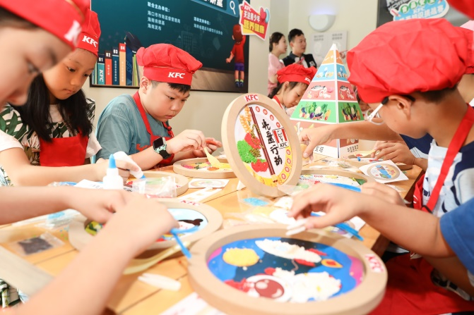 为了从小培养孩子们的健康饮食观念,肯德基的工作人员还将餐厅布置成了食安知识科普小讲堂,看着桌子上整齐摆放的汉堡制作原料,以及一个个用玉米、红豆、绿豆等谷物材料做成的创意画,同学们迫不及待的开始了谷物画制作。餐厅的工作人员还贴心的将“中国居民平衡膳食宝塔“做成了可爱的金字塔造型,方便同学们在动手的同时加深对合理膳食、吃动平衡的理解,鼓励更多的家庭关注孩子的健康成长,重视合理饮食和适量运动。