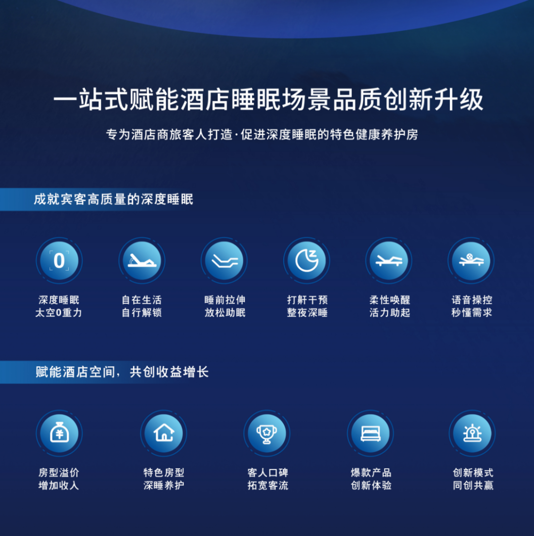 为解决这一消费诉求,悠游梦境全力推出「梦境深睡舱」,为酒店提供「AI人工智能床垫」、「智能电动床垫」,在不改变酒店原有房间结构的前提下,全面升级酒店智能睡眠场景。