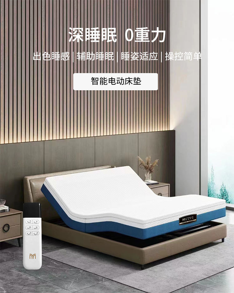 YYMJ·AI悠游梦境「智能电动床垫」,从睡前的助眠到睡中的睡姿自定义,再到睡后的自然苏醒,操作简单,无线遥控一键操控,自由调节升降高度,解决客户睡眠质量与睡眠困难问题。