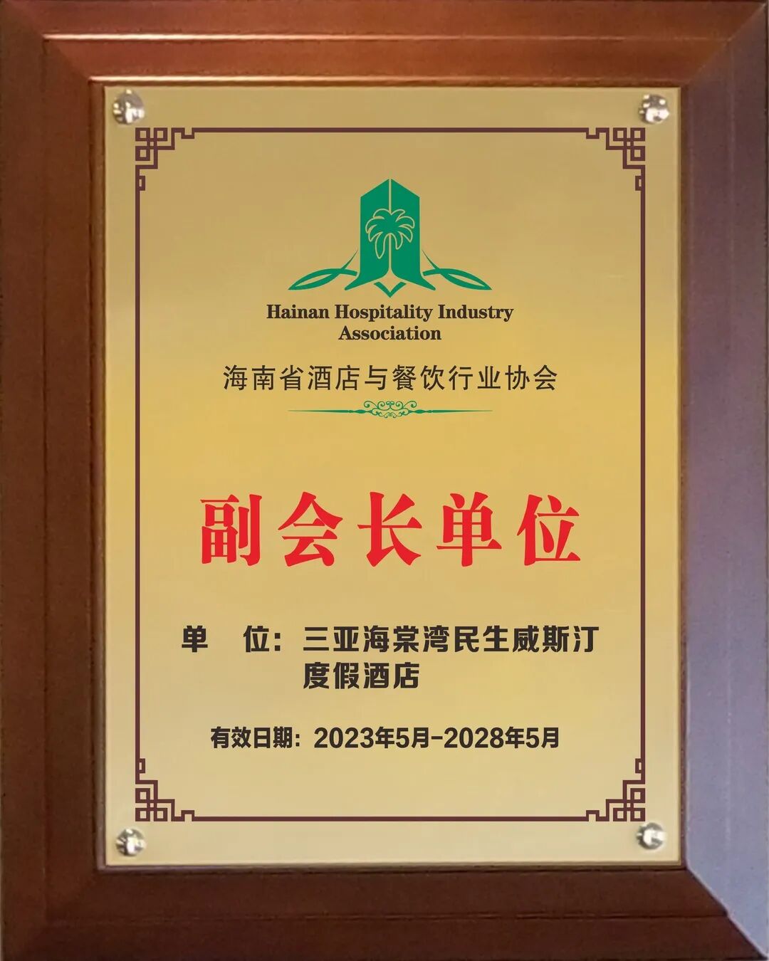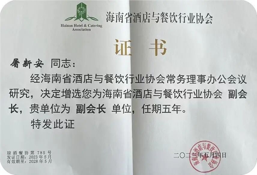 经海南省酒店与餐饮行业协会研究决定,增选三亚海棠湾民生威斯汀度假酒店为第四届理事会副会长单位,增选总经理屠新安为副会长,同时授予牌匾及证书