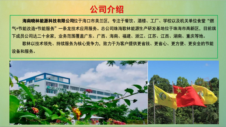 海南晓林能源科技有限公司位于海口市美兰区,专注于餐饮、酒楼、工厂、学校以及机关单位食堂“燃气+节能改造+节能服务”一条龙技术应用服务,专业从事燃气设备(蒸柜、炒炉、矮汤炉等)进行节能升级改造,通过设备升级改造,明显提升燃气利用率,达到安全可靠、操作简单、提升效率的优越性能。