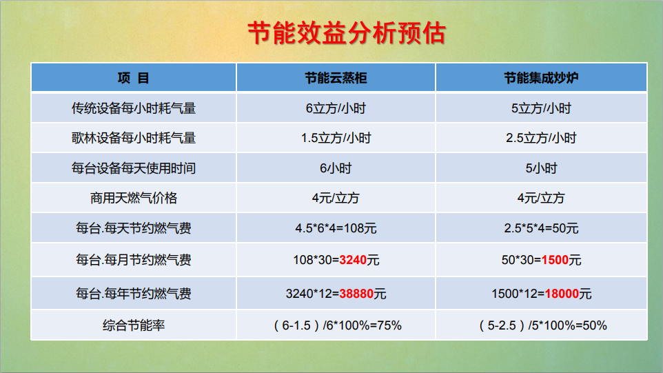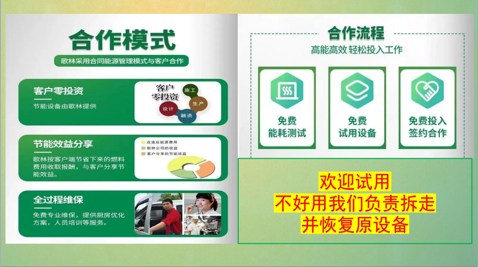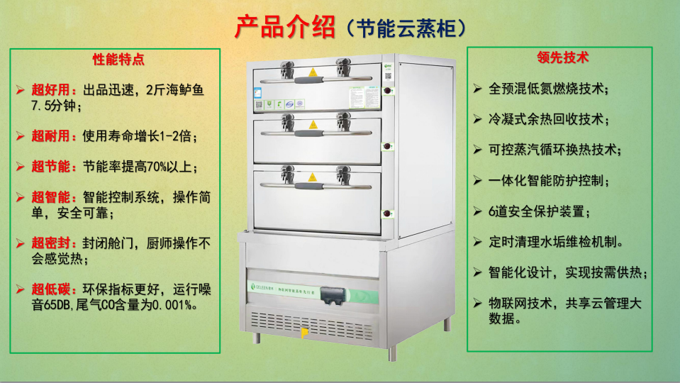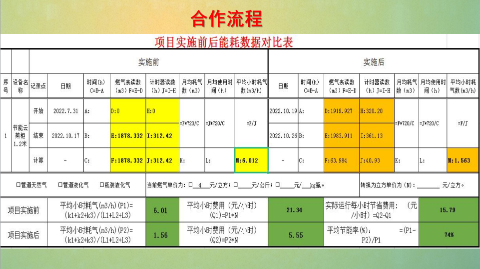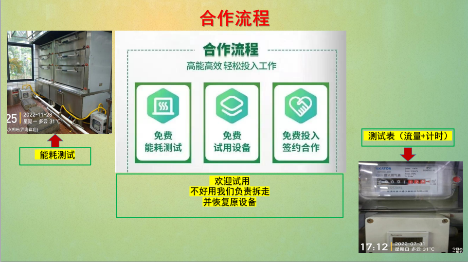 改造后的燃气设备不仅燃气消耗量较改造前节省60%以上,同时还可以有效改善工作环境。提供的高科技节能设备全部已申请国家专利保护,具有燃烧充分、噪音低、一氧化碳等废气排放低的产品优势。公司注重产品安全,智能蒸柜已通过中国质量检验中心CQC产品认证,安全可靠值得信赖,是商家的燃气设备保姆,为商家的用气安全保驾护航。所有需要改造的节能设备由乙方免费提供、免费服务,在商家节省下来的燃气费用中分享节能收益。