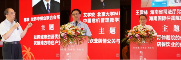 省酒店与餐饮行业协会会长、龙泉集团董事长符史钦致辞;海口市商务局蔡俏局长,中国饭店协会会长韩明,世界中餐业联合会常务副会长邢颖,北京大学MBA教授、中国危机管理教学第一人艾学蛟,海南省司法厅副厅长、海南国际仲裁院理事长王雪林分别在开幕式上作主题讲话。