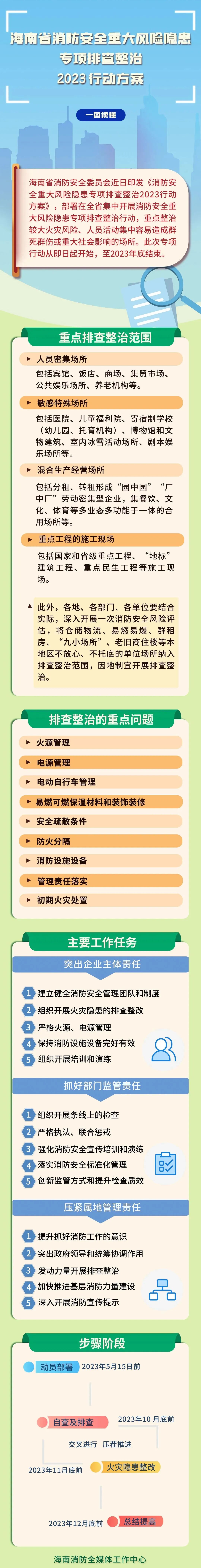 海南省安全生产委员会印发《海南省重大事故隐患专项排查整治2023行动实施方案》(以下简称《方案》),明确自《方案》印发之日起至2023年底,分动员部署、企业自查自改和部门帮扶、部门精准执法、总结提高四个阶段有序推进专项行动。