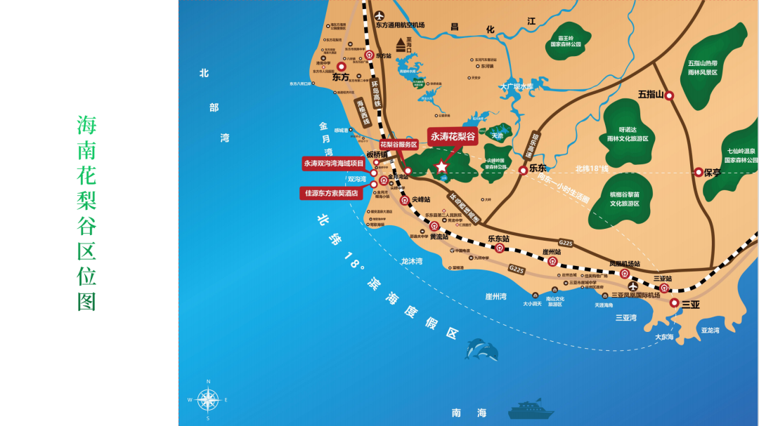 海南永涛花梨谷文化旅游度假区,国家AAAA级景区。位于海南省乐东黎族自治县和东方市境内,距西线环岛高速尖峰互通约7公里,尖峰互通口处北距海口美兰国际机场约290公里,南距三亚凤凰国际机场约97公里。沿项目区向西约1公里可到达225国道,沿225国道向北约14公里可到达金月湾高铁站,向南约18公里可到达尖峰高铁站,周边有现状道路与项目区相连,依山傍海,交通十分便利,区位条件好,并且海南省交通厅已通过海南永涛花梨谷文化旅游度假区高速开口申请。