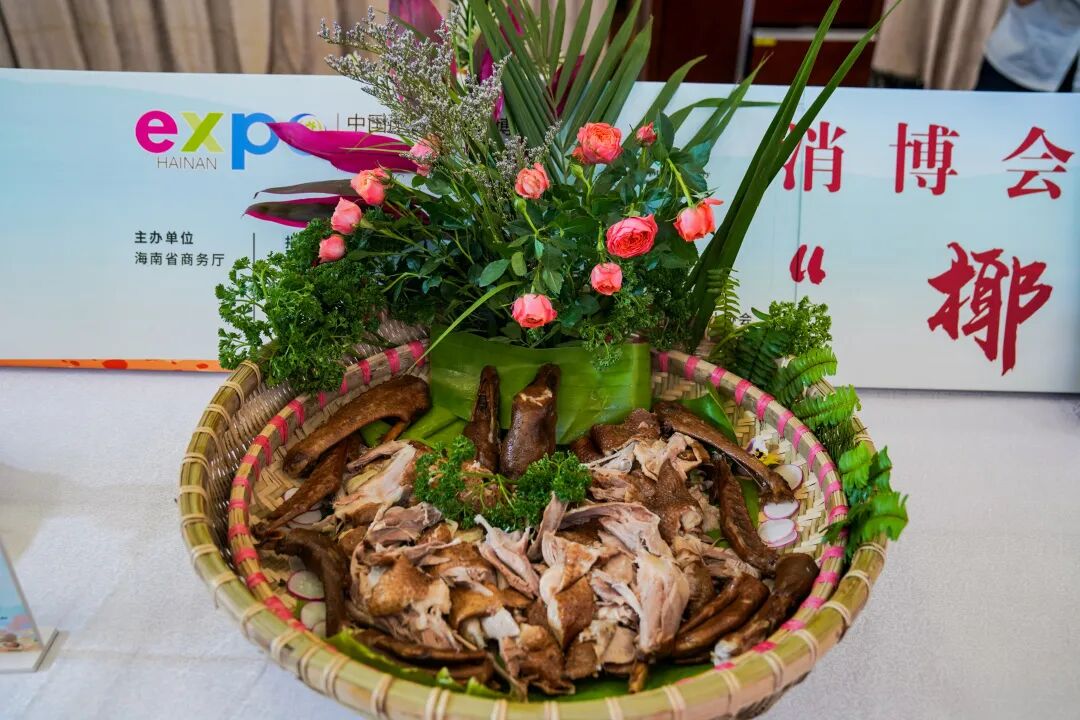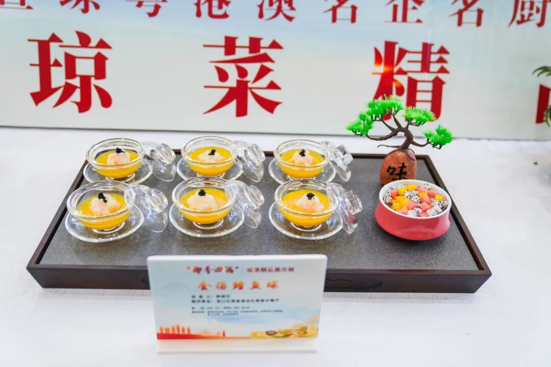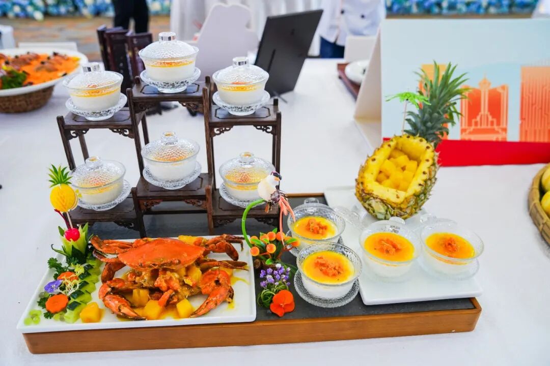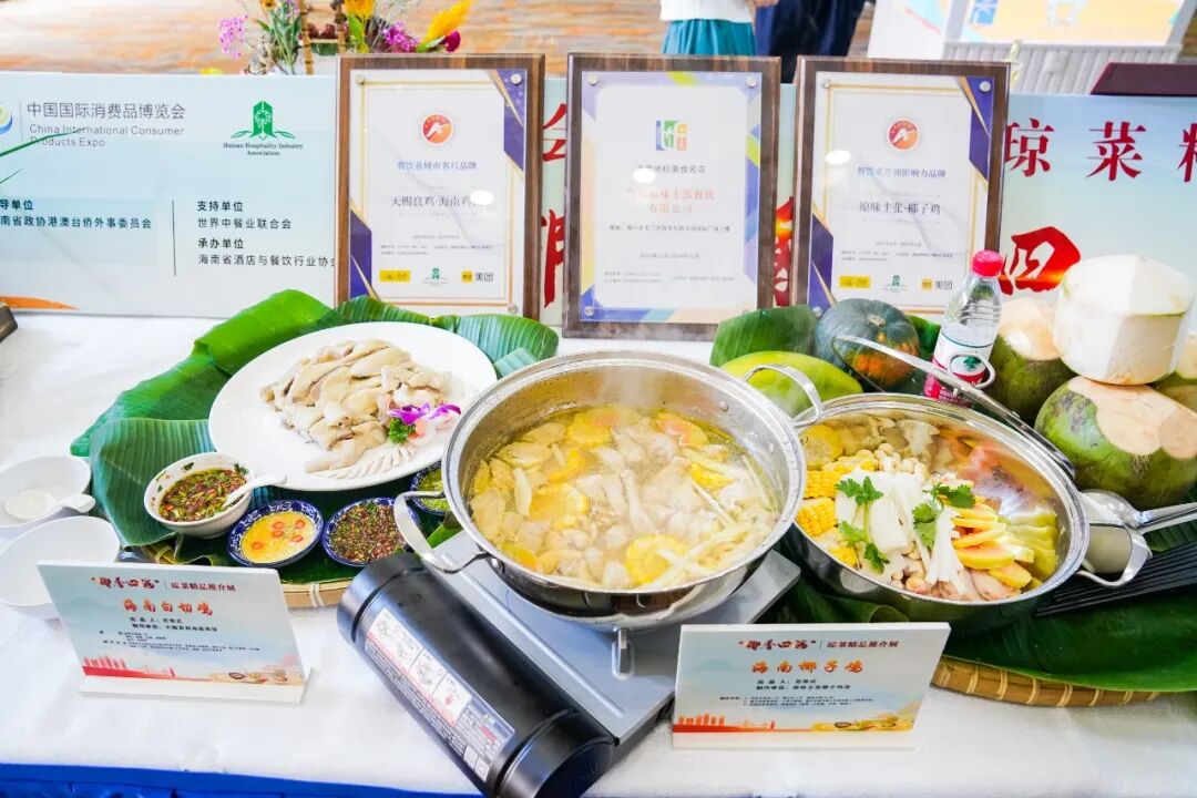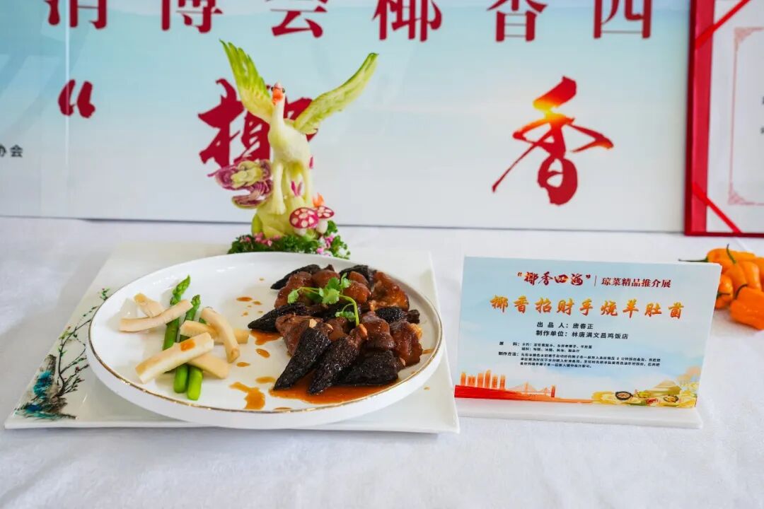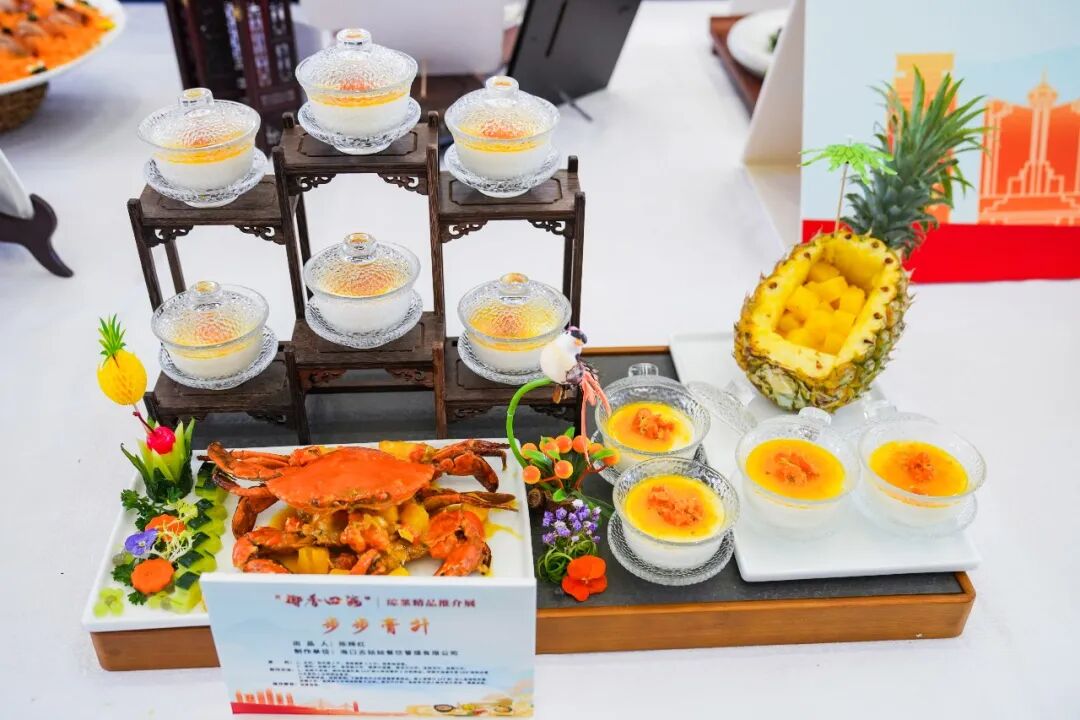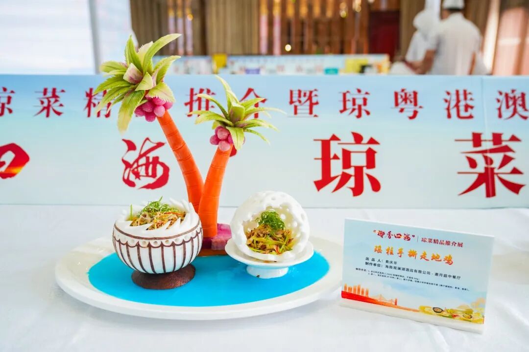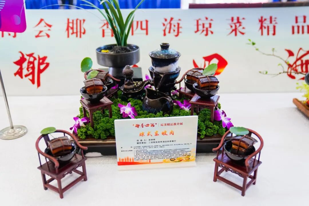 同期,为宣传推介琼菜精品,以“椰风海韵•国潮琼菜”为主题,启动仪式现场特设“椰香四海”琼菜精品展区,推介发布88道琼菜精品,其中由海南琼菜王、琼菜记忆、海南大院等省内名企团队出品推介“琼崖三宝、盐焗香螺、海味八宝鸽”等80道琼菜精品,由海南餐饮龙头企业——龙泉集团出品推介一席龙泉文昌鸡全宴,通过创意的烹饪、经典的味道、精辟的文字、美感的设计、生动的图片,记录属于琼菜精品的独特印象。现场邀请18位海南知名小红书/抖音达人打卡宣传,共同宣推消博会琼菜名宴名菜精品。