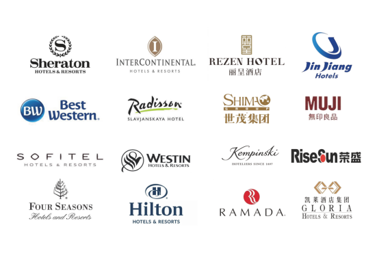 我们的客户包括从国内外知名的希尔顿集团,洲际酒店集团,温德姆酒店集团,锦江集团,世茂集团,丽呈集团,荣盛集团,到众多独特和知名的独立品牌酒店。
