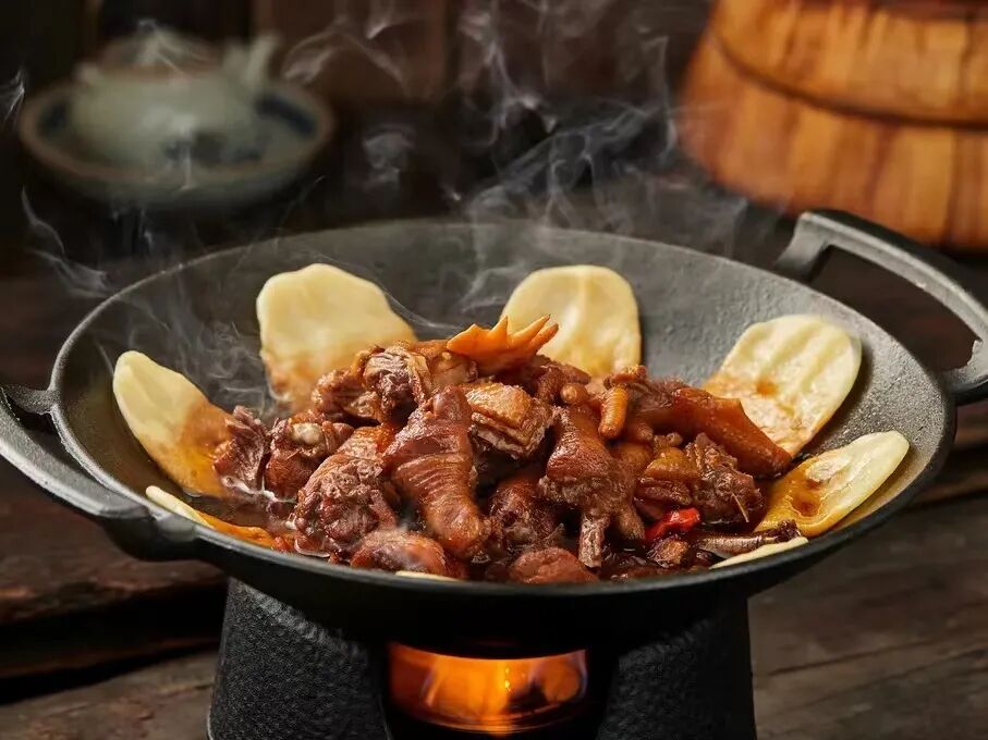 “东坡五关鸡”是“徐州地锅鸡”原型。相传北宋年间,苏东坡在徐州云龙山捕得野鸡,烧柴架锅烹煮,鲜香无比,但是愧意犹生,苏东坡一边吃鸡,一边为所吃之鸡做法超度,既不耽误鸡升天,也不耽搁自己成佛,同时还能满足口腹之欲,还给出了一个“凡鸡皆有一死”来宽慰自己。后人按苏东坡做法煮上一锅菜,还要贴满面饼,便产生了这种饭菜合一的烹调方法—地锅菜。地锅鸡汤汁较少,口味鲜醇,饼借菜味,菜借饼香,具有软滑与干香并存的特点。