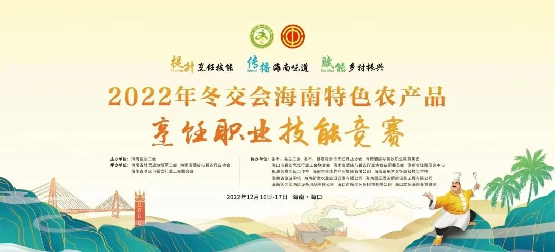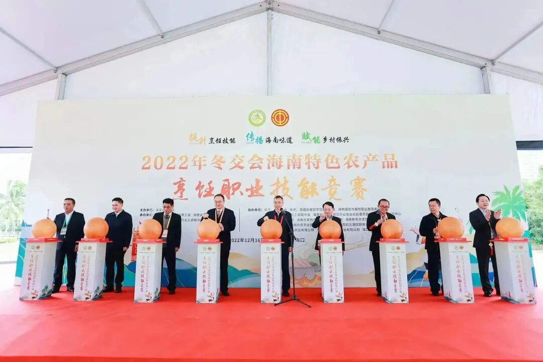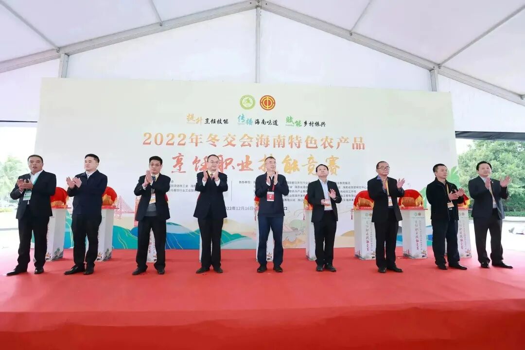 12月16日上午,由海南省总工会主办,海南省财贸旅游烟草工会、省酒店与餐饮行业协会、省酒店与餐饮行业工会联合会承办,各市县总工会、餐饮烹饪行业协会以及海南酒店与餐饮职业教育集团、海口市餐饮烹饪行业工会联合会、省酒店与餐饮行业协会名厨专业委员会、省琼菜研究中心、邢涛劳模创新工作室等单位协办的“2022年冬交会海南特色农产品烹饪职业技能竞赛”在海南国际会展中心隆重举行。省人大常委会副主任、省总工会主席陆志远,省人力资源和社会保障厅一级巡视员林琳,省总工会党组成员、副主席何清,省农业农村厅总农艺师李鹏,省商务厅二级巡视员王建国,省财贸旅游烟草工会常务副主席童智忠,省人力资源开发局职业技能鉴定处处长欧善德,海口市总工会党组副书记、常务副主席刘川海,省酒店与餐饮行业协会执行会长陈恒,海口市餐饮烹饪行业协会会长林壮森,海口市财贸工会主席林银燕以及各市县总工会和餐饮烹饪协会相关负责人,省内酒店餐饮企业负责人、参展企业、参赛选手、媒体代表500余人参加。