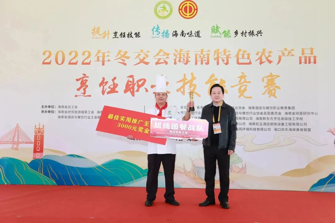 海南省五一奖章获得者、省酒店与餐饮行业协会名厨委执行主席张光平为最佳实用推广金奖获得者颁发证书