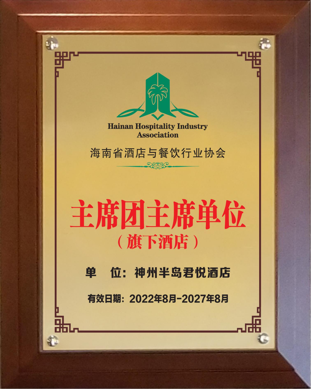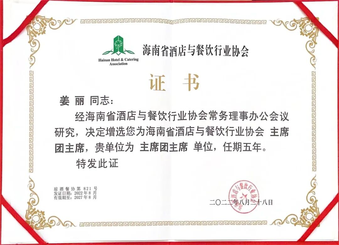 经海南省酒店与餐饮行业协会研究决定,增选中海凯骊酒店管理有限公司神州半岛酒店集群为第四届理事会主席团主席单位,增选中海凯骊酒店管理有限公司神州半岛区域总经理姜丽女士为主席团主席。