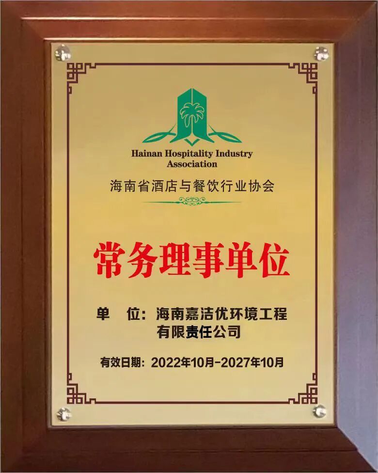 经海南省酒店与餐饮行业协会研究决定,增选海南嘉洁优环境工程有限责任公司为第四届理事会常务理事单位,增选总经理陈育为常务理事,同时授予牌匾及证书。