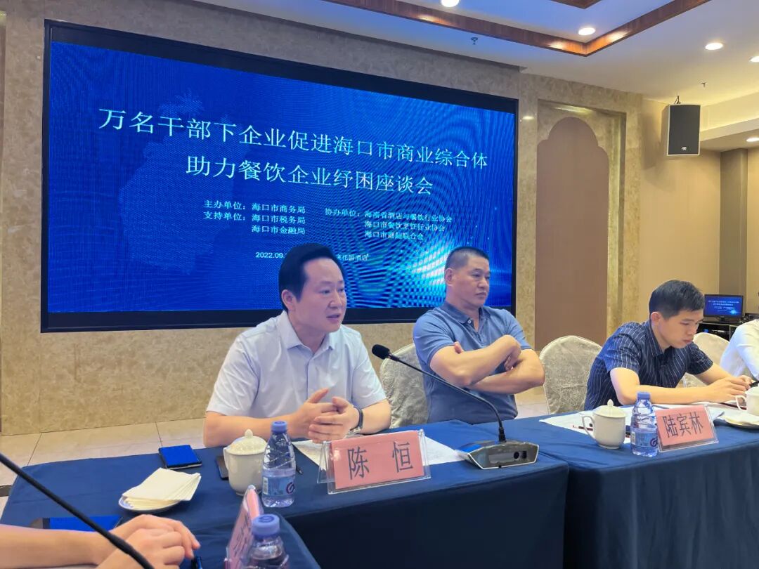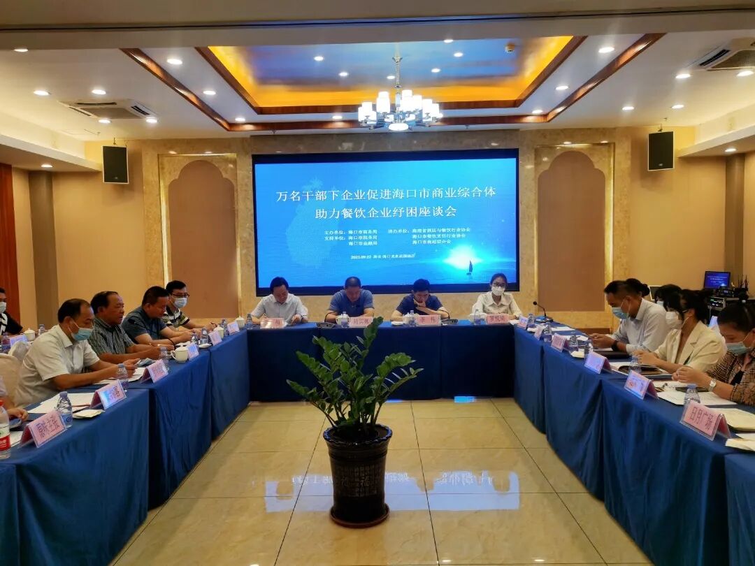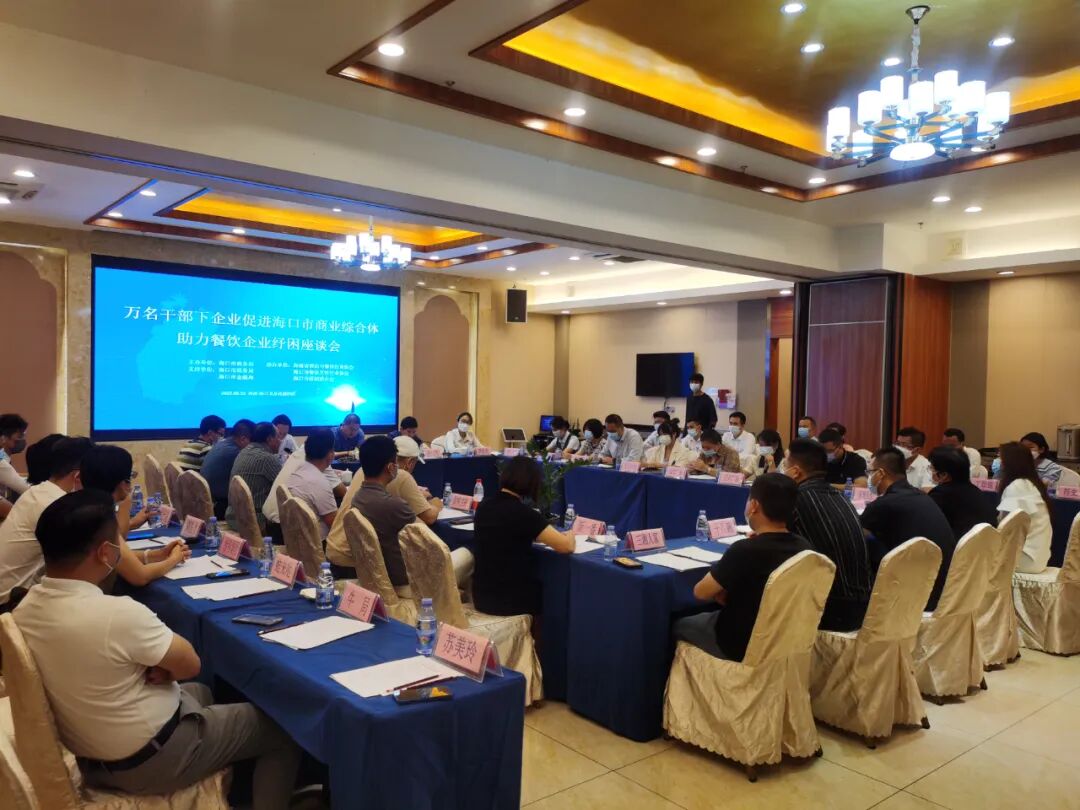 为落实好《海口市统筹疫情防控和经济恢复提振实施方案》,按照全省“万名干部下企业”服务行动的统一部署,尽快落实我市商贸企业各项纾困政策,搭建商业体与餐企对话平台,共商减租或缓缴租金等纾困解难之策,助力企业发展,增强企业发展信心,推动经济加快恢复重振。9月22日下午,海口市商务局联合省市餐饮行业协会和海口市商超联合会召开"万名干部下企业促进海口市商业综合体助力餐饮企业纾困座谈会"。海口市商务局调研员陆宾林,省酒店与餐饮行业协会执行会长、市餐饮烹饪行业协会资深会长陈恒和秘书长陈刚,海口市商超联合会秘书长罗悦琦,龙泉集团、拾味集团(拾味馆)、九毛九、十八碗、豪约客、麦当劳、肯德基、新一番回转寿司、原味主张、幕得·普洛旺斯、三湘人家、星巴克、蛙来哒、牛局等重点品牌餐饮企业负责人,日月广场、友谊阳光城、桫椤湾、望海国际广场、新城吾悦广场、万象城、上邦百汇城、湖城大境、N 次方、远大广场、万达广场等重点商业综合体相关负责人60多人参加座谈会。