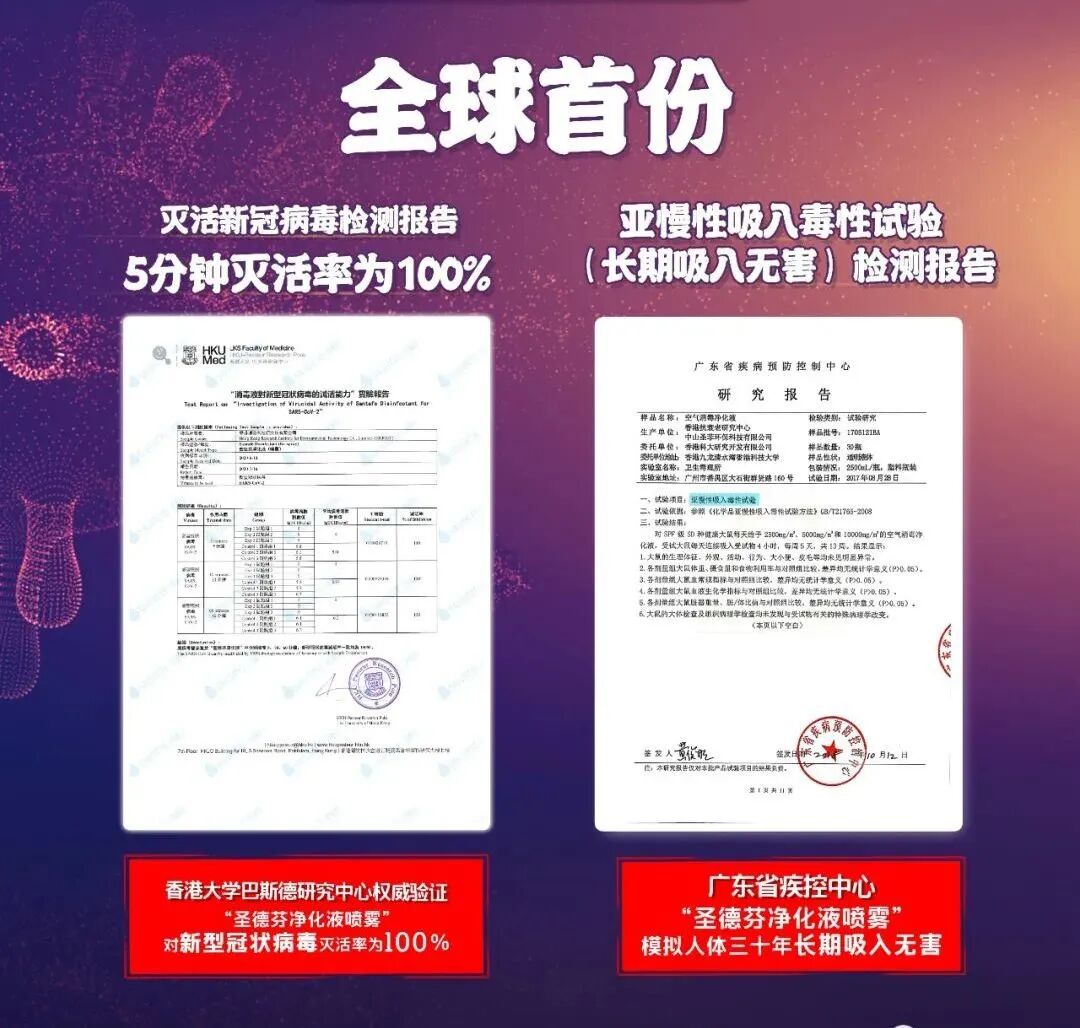 产品先后经过广东省疾病预防控制中心,广州工业微生物检测中心、 钟南山院士领导的广州呼吸健康研究院、香港大学巴斯德研究中心等多家权威检测构,并通过亚慢性吸入毒性试验(人体长期吸入无害)。