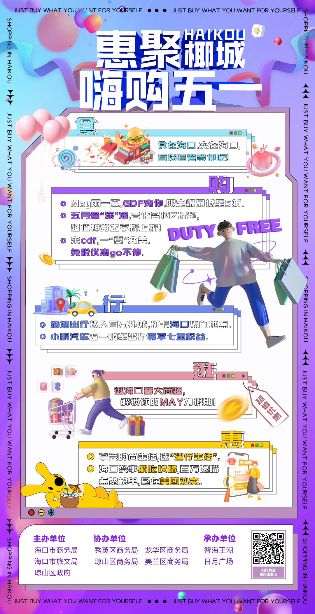 由海口市商务局、海口市旅文局、琼山区政府主办的“惠聚椰城,嗨购五一"促消费活动于4月29日晚在海口日月广场启动,海口市政府副市长黄舸出席并讲话,海南省消费局副局长何一楠,海口市商务局党组书记、局长王明夫,副局长胡珊和政府有关部门及活动承办、协办等相关单位负责人参加启动仪式。海南省酒店与餐饮行业协会联合海南睿德科技、美团、建行海南省分行、抖音、旅居客等平台加入节日消费主题活动,携手海口1200多家重点餐饮品牌(含酒店餐饮)推出各种系列优惠消费活动,助力海口消费市场恢复,赋能五一黄金档期。