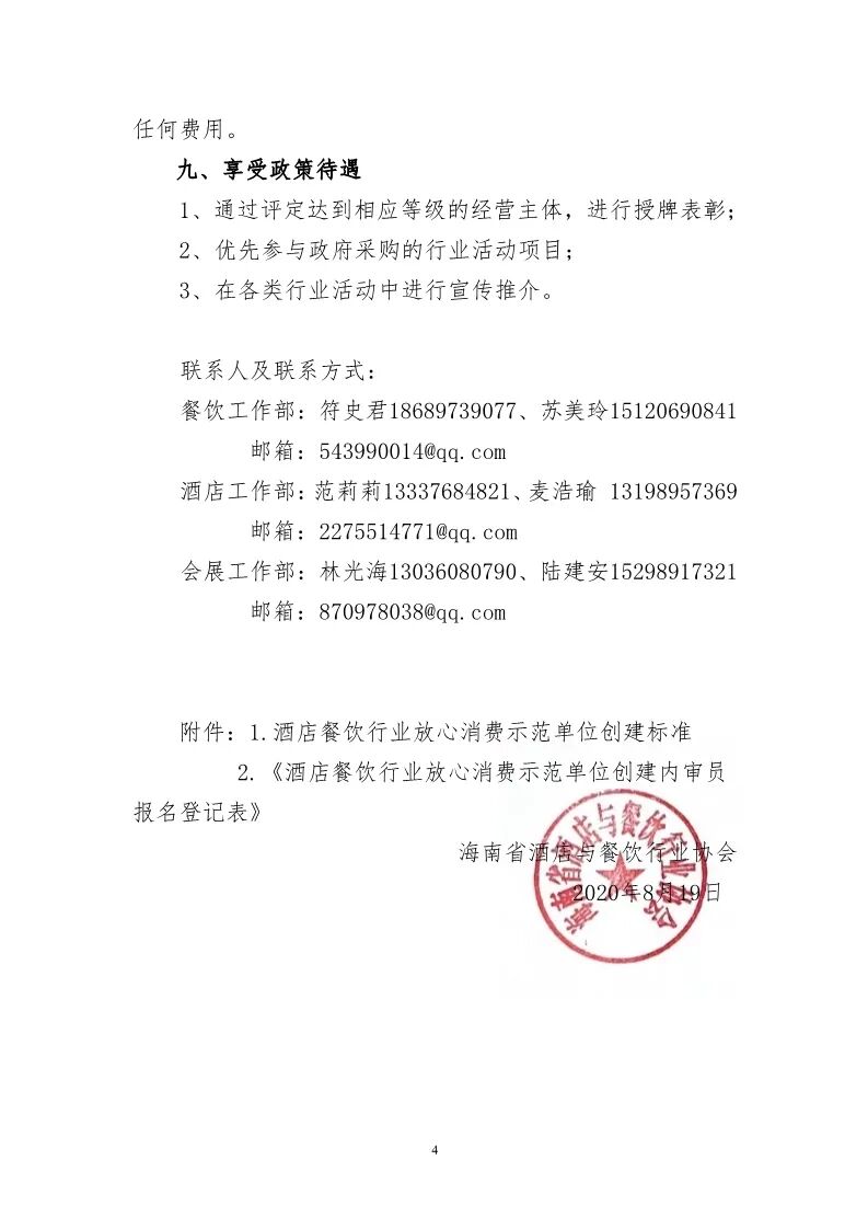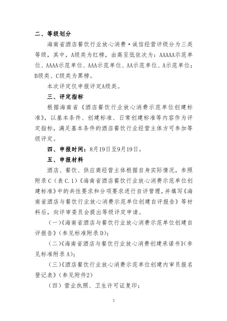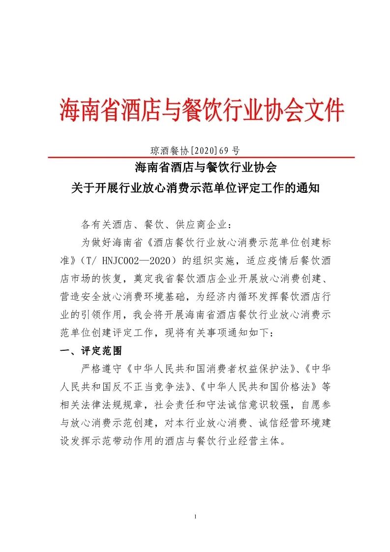 为做好海南省《酒店餐饮行业放心消费示范单位创建标准》(T/ HNJC002—2020)的组织实施,适应疫情后餐饮酒店市场的恢复,奠定我省餐饮酒店企业开展放心消费创建、营造安全放心消费环境基础,为经济内循环发挥餐饮酒店行业的引领作用,我会将开展海南省酒店餐饮行业放心消费示范单位创建评定工作,申报时间为8月19日至9月19日。通知文件如下: