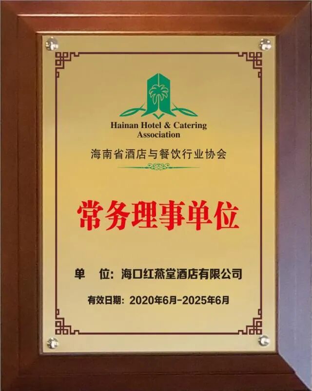 经海南省酒店与餐饮行业协会研究决定,增选海口红燕堂酒店有限公司为第四届理事会常务理事单位,增选总经理景国伟为常务理事,同时授予牌匾及证书。